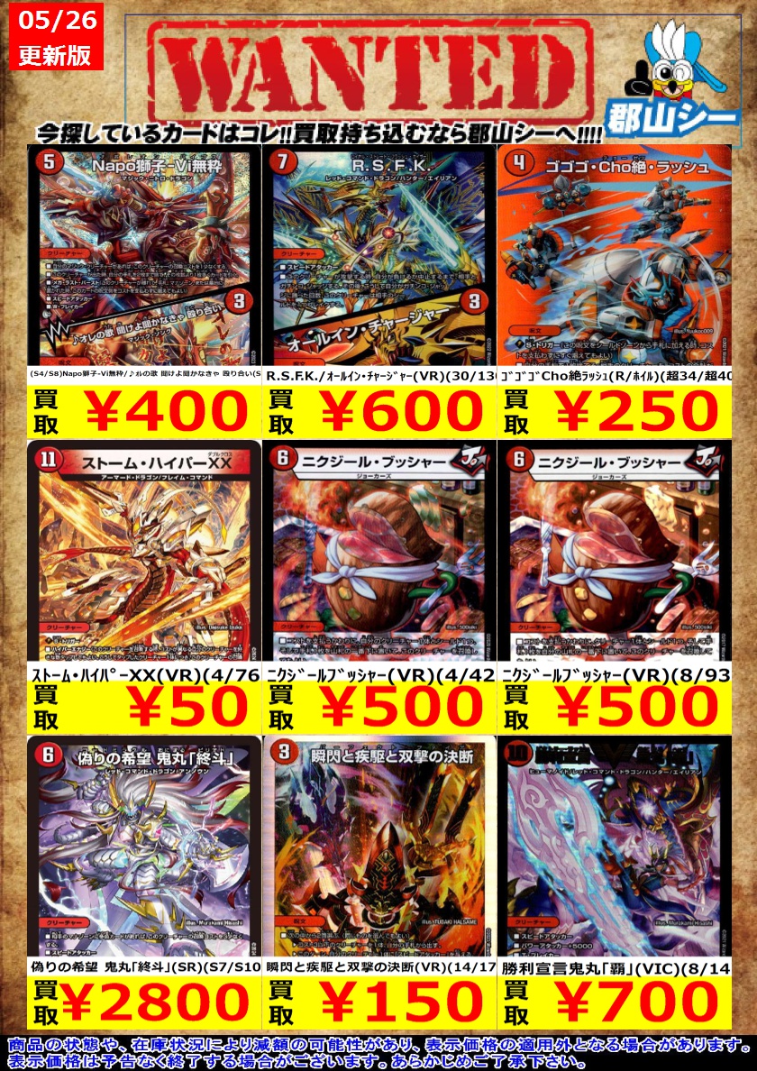 シーガル郡山店デュエマお買取り情報!! ※商品の状態や在庫状況により減額の可能性があり、表示価格の適用外となる場合がございます。 ストーム・ハイパーXX(VR)(4/76) ¥50 暴走龍 5000GT(VIC)(3/14) ¥400 (S4/S8)Napo獅子-Vi無粋/♪オレの歌 聞けよ聞かなきゃ 殴り合い(SR) ¥400