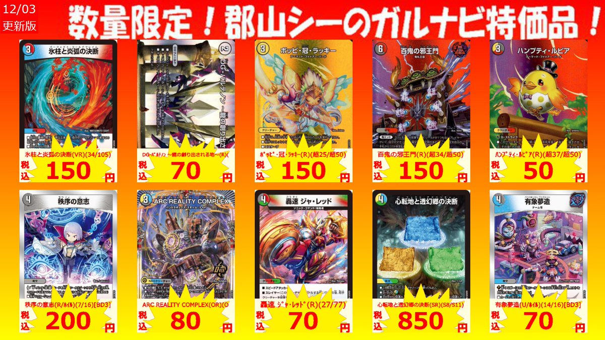 数量限定!郡山シー限定ガルナビ特価品 洗打の妖精(U)(34/77) ¥100 悪名き侵略 レッドアウト(SR)(7/105) ¥150 ネオ・ボルメテウス・ホワイト・ドラゴン(SR)(18/105) ¥150 #デュエマ #シーガル郡山 #アツアツ特価