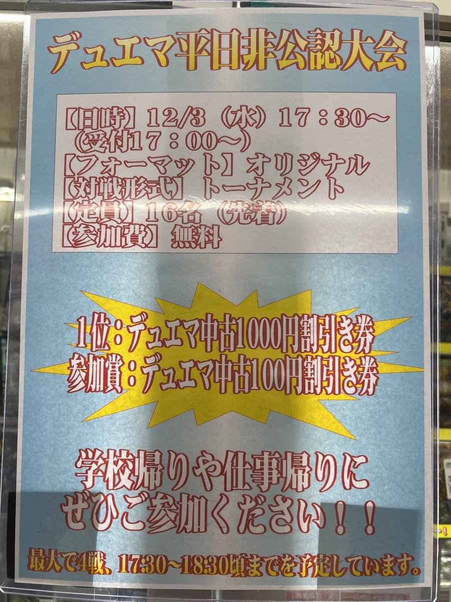 いつもの!デュエマ平日非公認大会は本日開催です✨️ 受付は17時から先着順‼️ ご参加お待ちしております(*´ω`*)