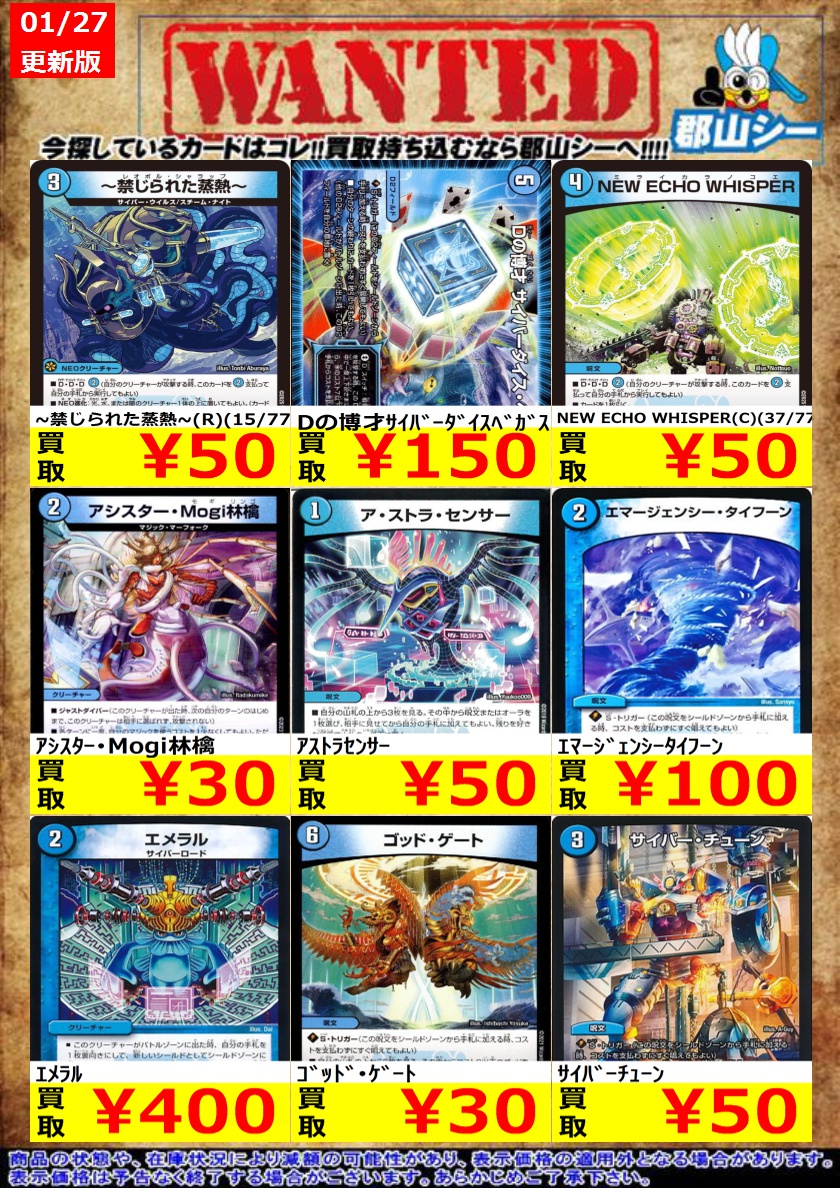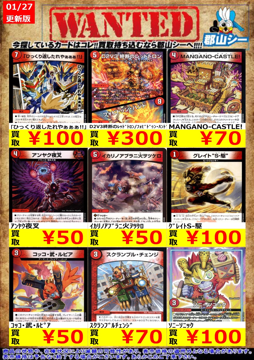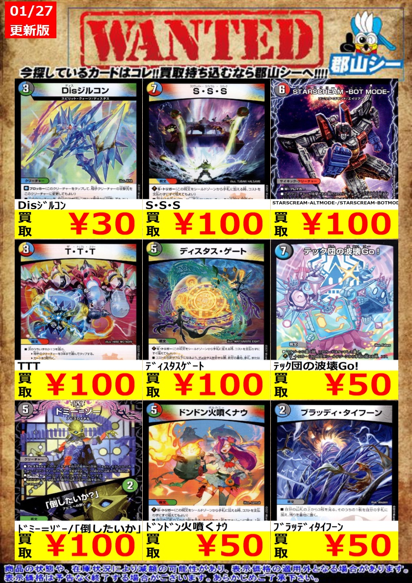 シーガル郡山店デュエマノーマルお買取り情報!! ※商品の状態や在庫状況により減額の可能性があり、表示価格の適用外となる場合がございます。 テック団の波壊Go! ¥50 ブラッディタイフーン ¥50 ドンドン火噴くナウ ¥50
