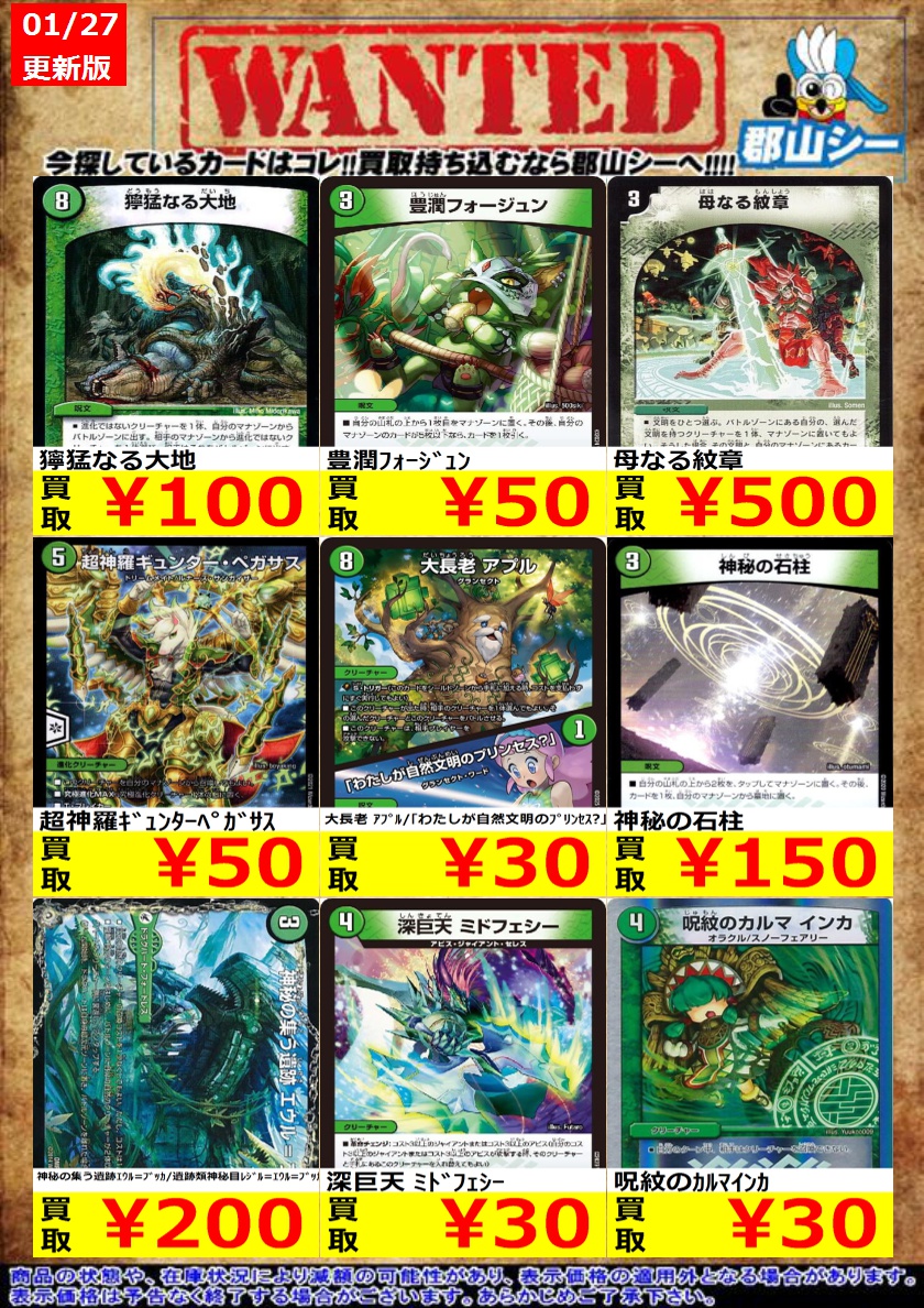 シーガル郡山店デュエマノーマルお買取り情報!! ※商品の状態や在庫状況により減額の可能性があり、表示価格の適用外となる場合がございます。 獰猛なる大地 ¥100 桜風妖精ステップル ¥30 トラップの地版 ¥30