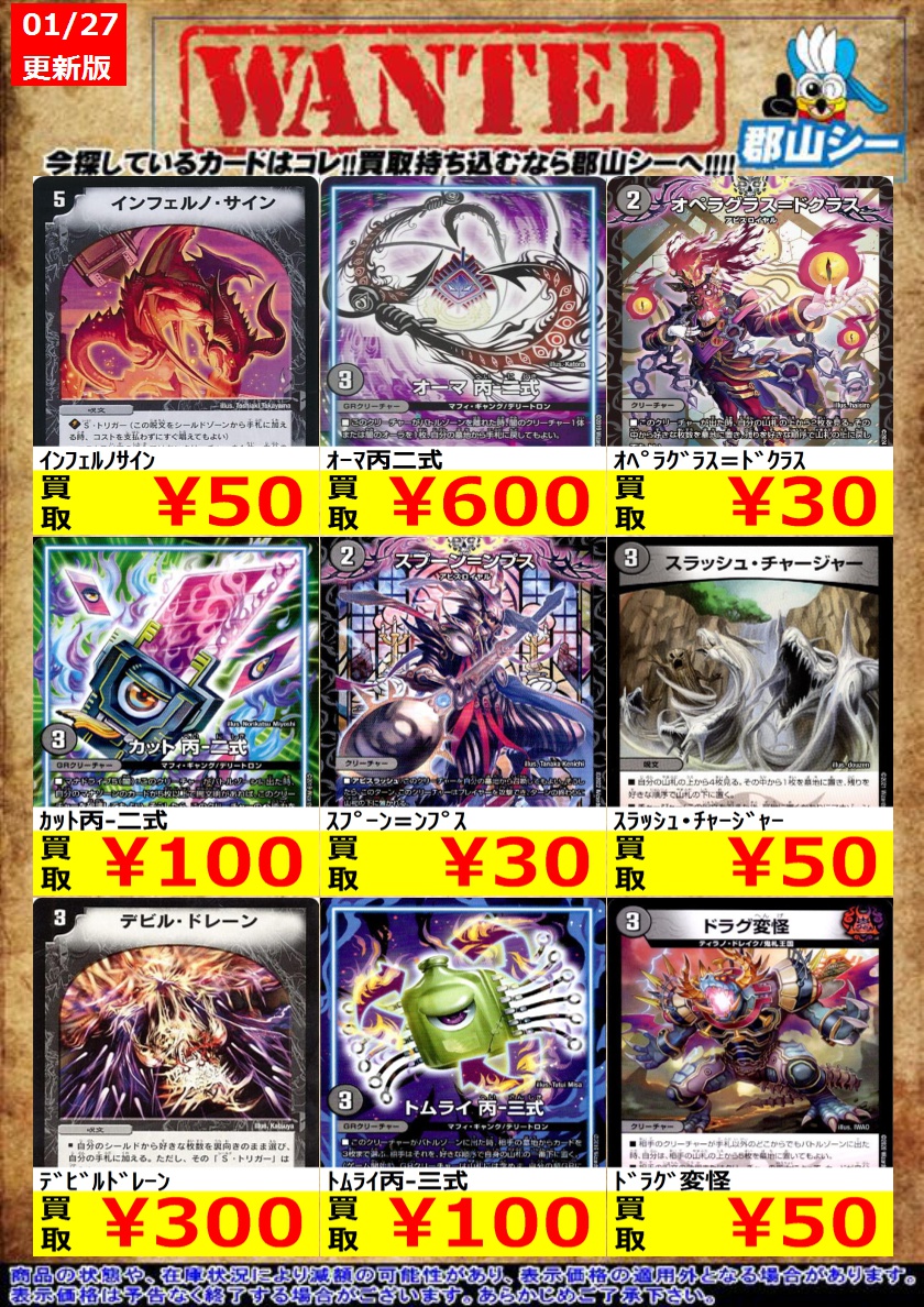 シーガル郡山店デュエマノーマルお買取り情報!! ※商品の状態や在庫状況により減額の可能性があり、表示価格の適用外となる場合がございます。 ポジトロンサイン ¥100 忍風の聖光 fu53n(C)(56/77) ¥30 トライガードチャージャー ¥50