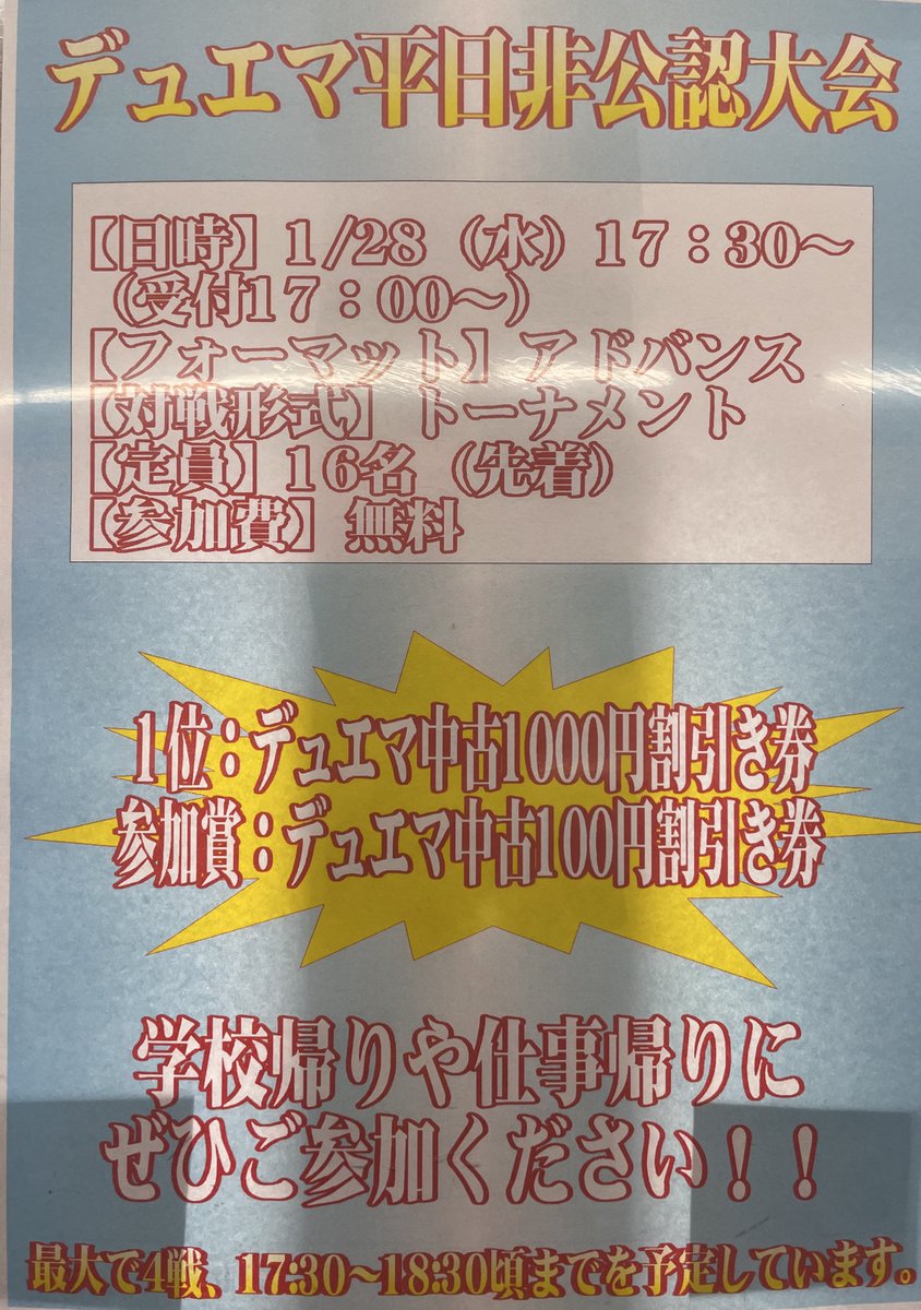1月28日にデュエマ平日非公認大会を行います❗️ 参加費無料、優勝賞品はデュエマ中1000円割引券です✨ ご参加お待ちしております🙇♂️