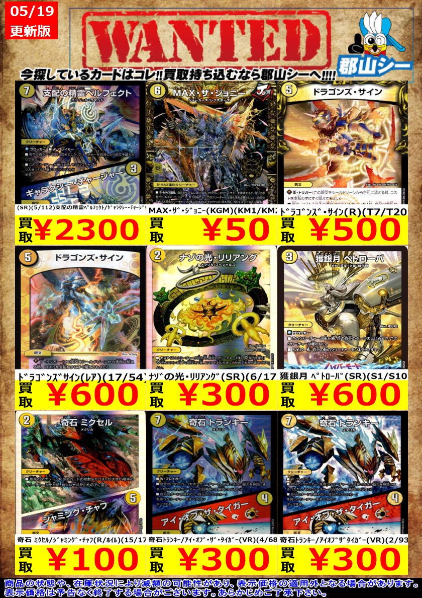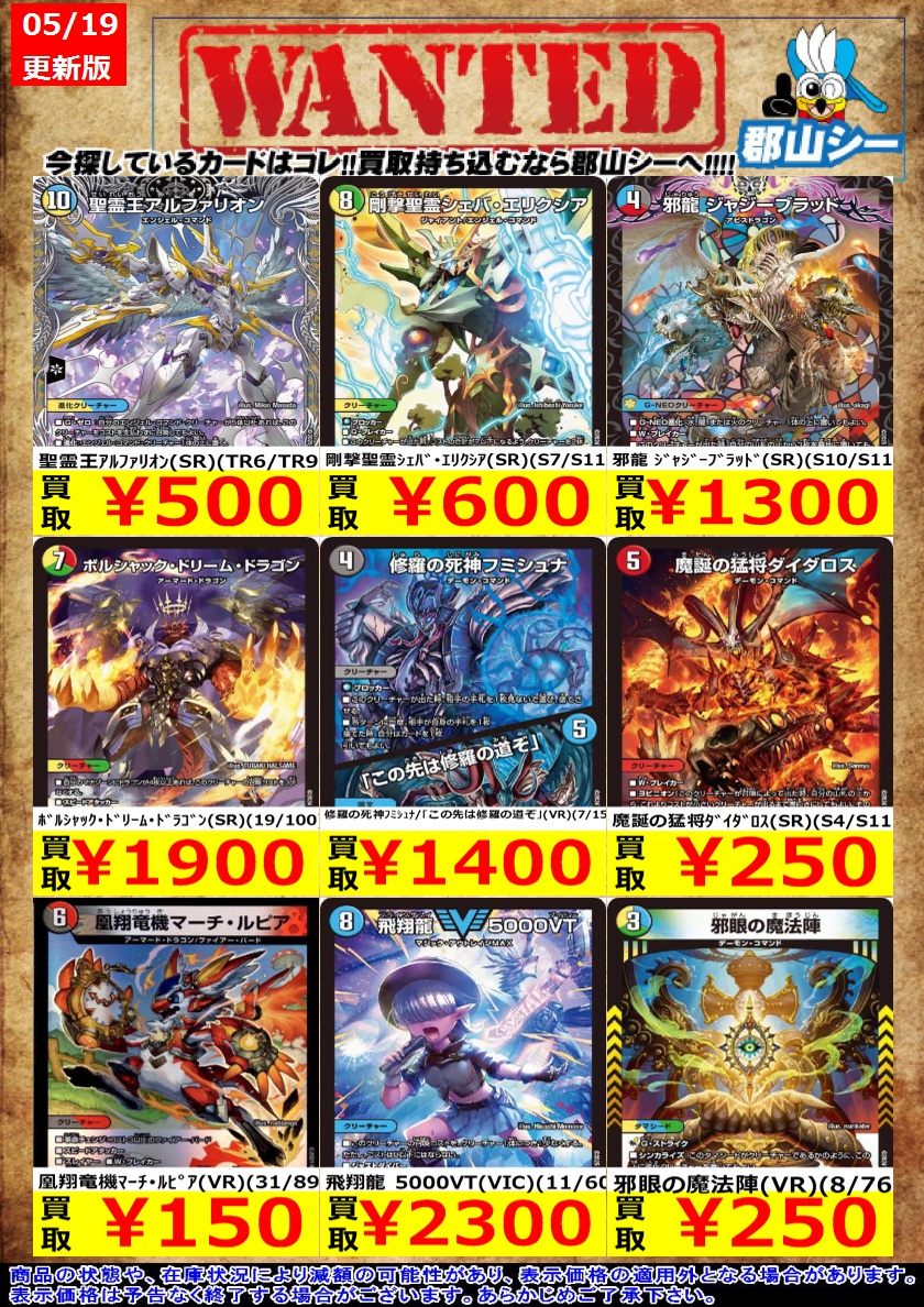 シーガル郡山店デュエマお買取り情報!! ※商品の状態や在庫状況により減額の可能性があり、表示価格の適用外となる場合がございます。 聖霊王アルファリオン(SR)(TR6/TR9) ¥500 剛撃聖霊シェバ・エリクシア(SR)(S7/S11) ¥600 邪龍 ジャジーブラッド(SR)(S10/S11) ¥1,300