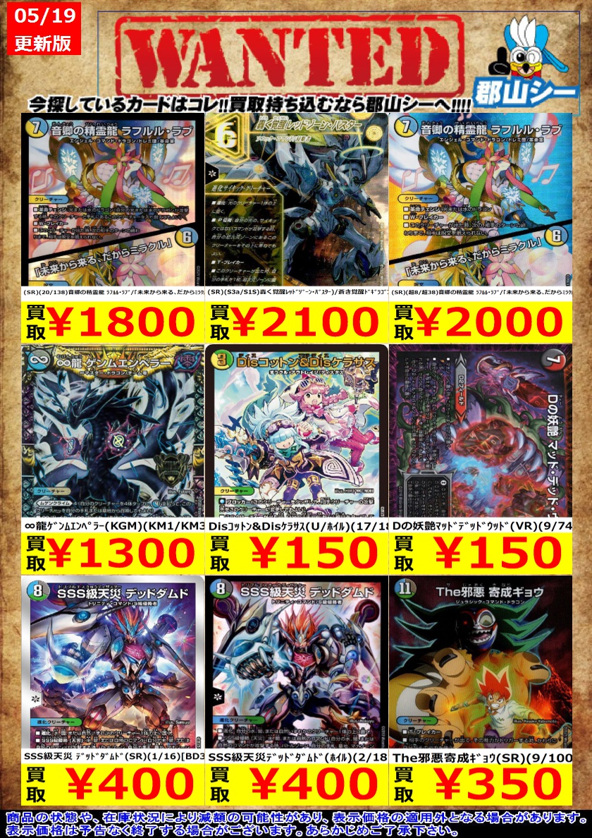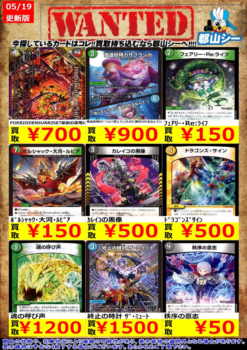 シーガル郡山店デュエマノーマルお買取り情報!! ※商品の状態や在庫状況により減額の可能性があり、表示価格の適用外となる場合がございます。 フェアリー・Re:ライフ ¥150 FORBIDDENSUNRISE?禁断の夜明け? ¥700 怪盗妖精カサブランカ/「信じていたのに裏切られるなんて!」 ¥900