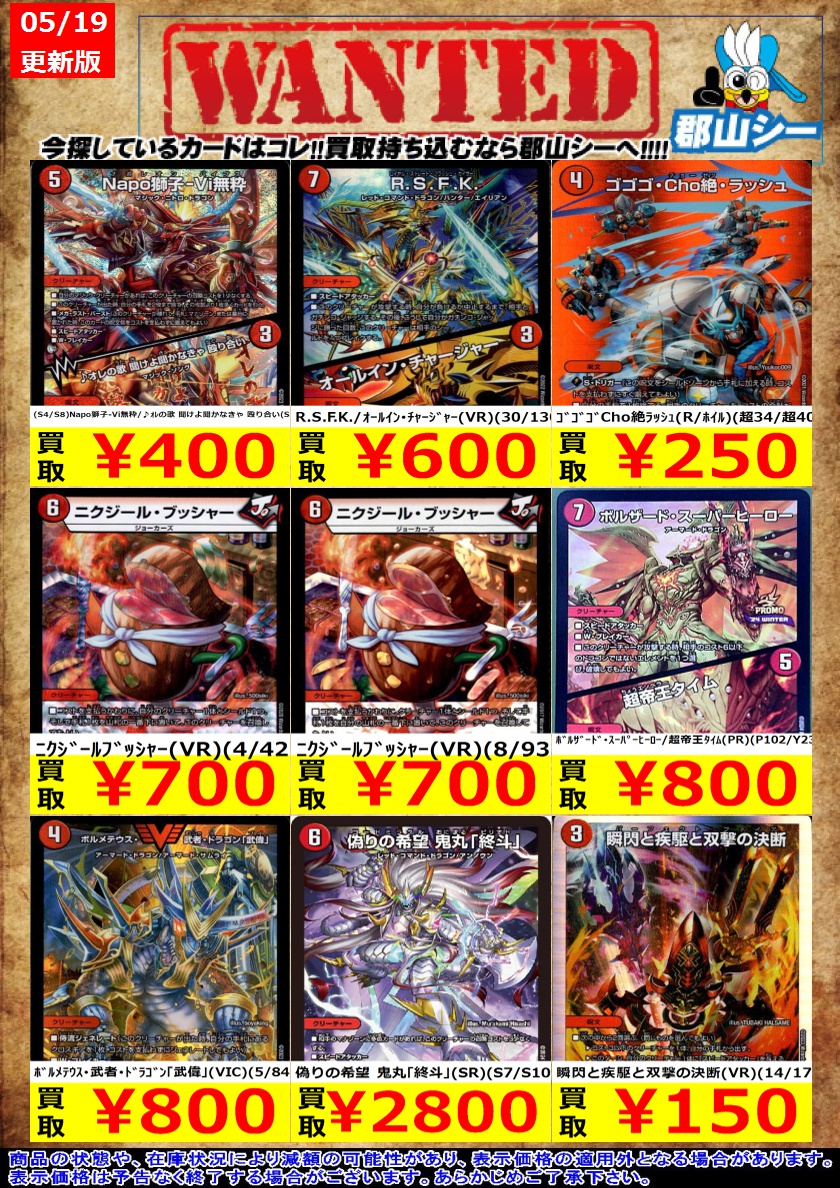 シーガル郡山店デュエマお買取り情報!! ※商品の状態や在庫状況により減額の可能性があり、表示価格の適用外となる場合がございます。 R.S.F.K./オールイン・チャージャー(VR)(30/130) ¥600 ニクジールブッシャー(VR)(4/42) ¥700