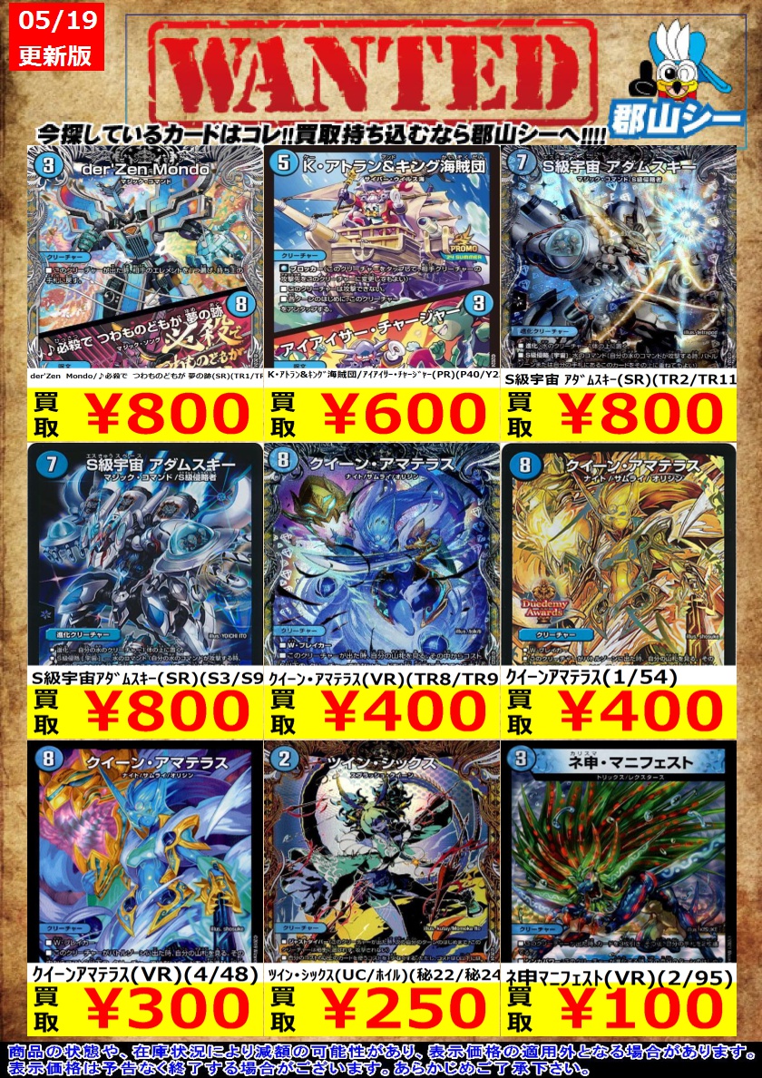 シーガル郡山店デュエマお買取り情報!! ※商品の状態や在庫状況により減額の可能性があり、表示価格の適用外となる場合がございます。 奇天烈シャッフ(VR)(4/87) ¥200 卍新世壊卍(VR)(30/138) ¥200 クイーン・アマテラス(VR)(TR8/TR9) ¥400