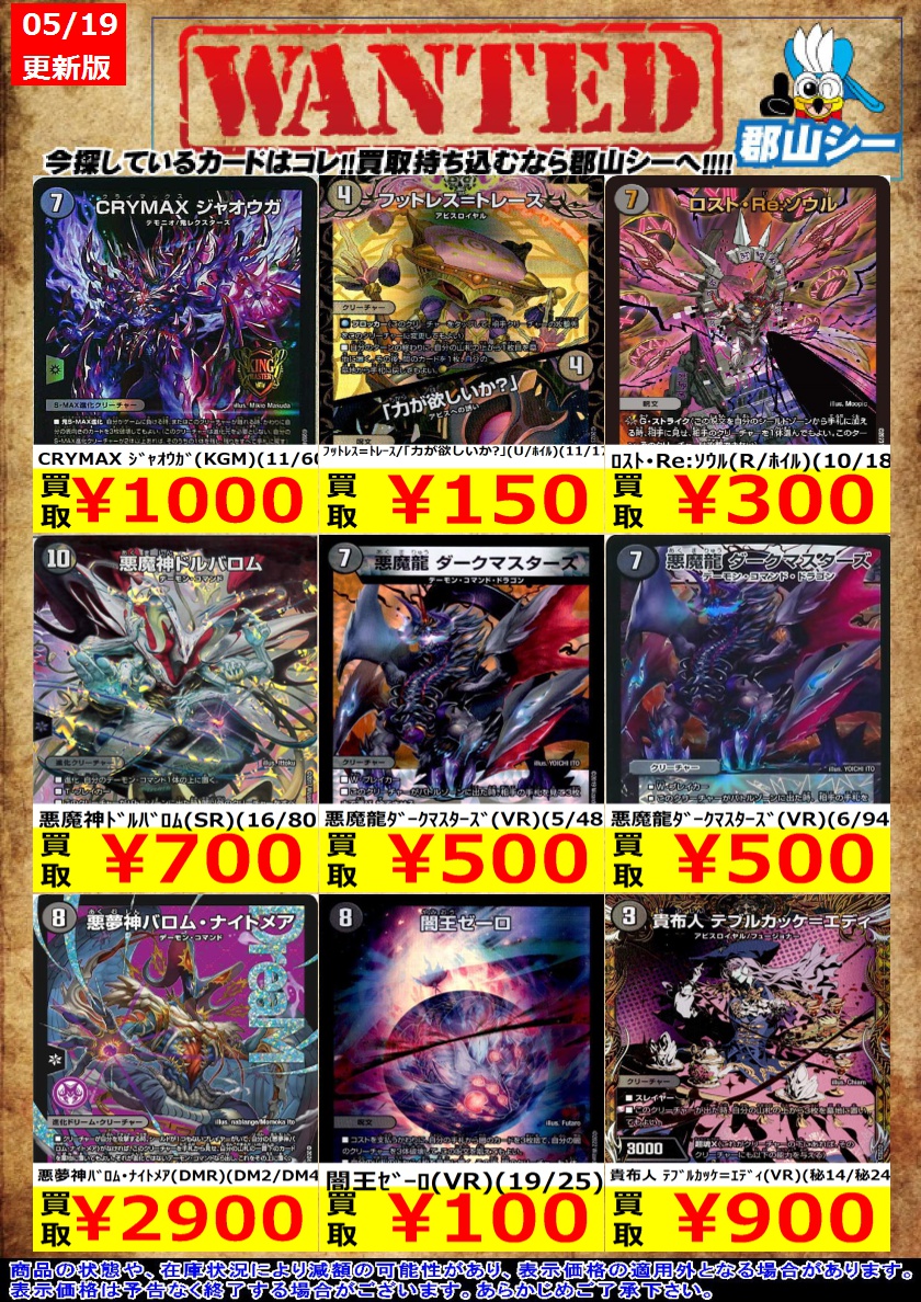 シーガル郡山店デュエマお買取り情報!! ※商品の状態や在庫状況により減額の可能性があり、表示価格の適用外となる場合がございます。 闇王ゼーロ(VR)(19/25) ¥100 邪幽 ジャガイスト(VIC)(4/84) ¥150 ロスト・Re:ソウル(R/ホイル)(10/18) ¥300