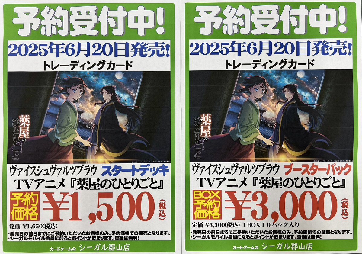 【ご予約受付中】 6/20 発売 #ヴァイスシュヴァルツブラウ TVアニメ『薬屋のひとりごと』 ✅スタートデッキ ✅ブースターパック ただいま予約受付中です❗️ ご予約お待ちしております😊 #シーガル郡山店予約