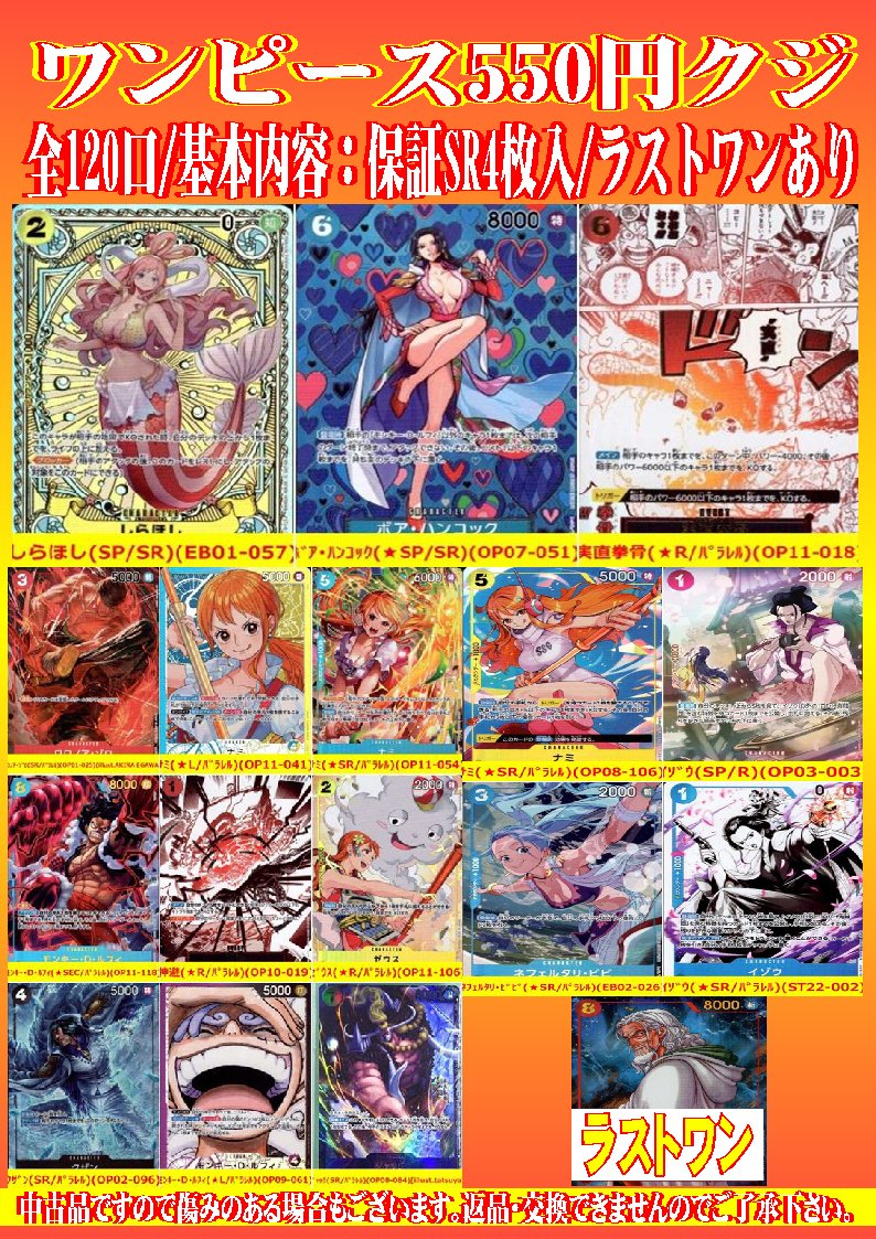シーガル郡山店です! ワンピ550円クジ無くなったので作成致しました‼️ 全120口でラストワンありとなっております。 よろしくお願いします。