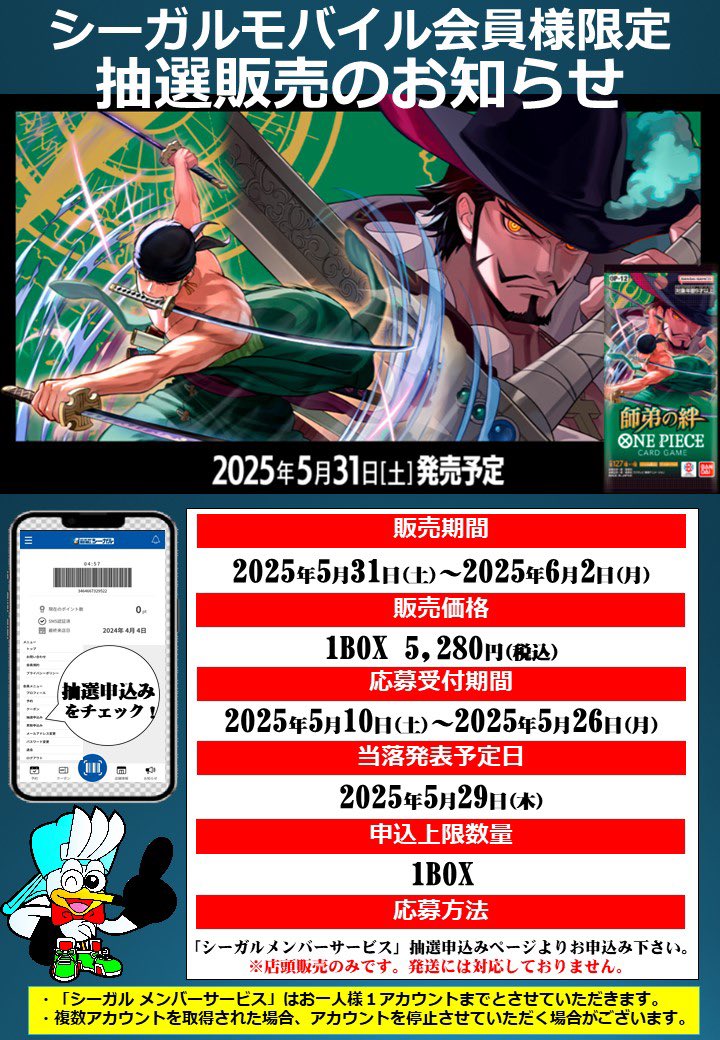 ✅抽選予約受付中 5/31発売予定 ワンピースカードゲーム ブースターパック『師弟の絆』 上記商品の抽選予約をガルモバにて開始しております。 詳細は、下記画像をご確認をお願いいたします。 ※抽選応募にはガルモバへの登録が必須となります。