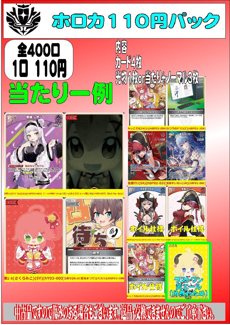 こんにちは(」・ω・) シーガル郡山店です。 ホロカ 110円オリパを新しく作成致しました。 ご来店お待ちしております(*´˘`*)