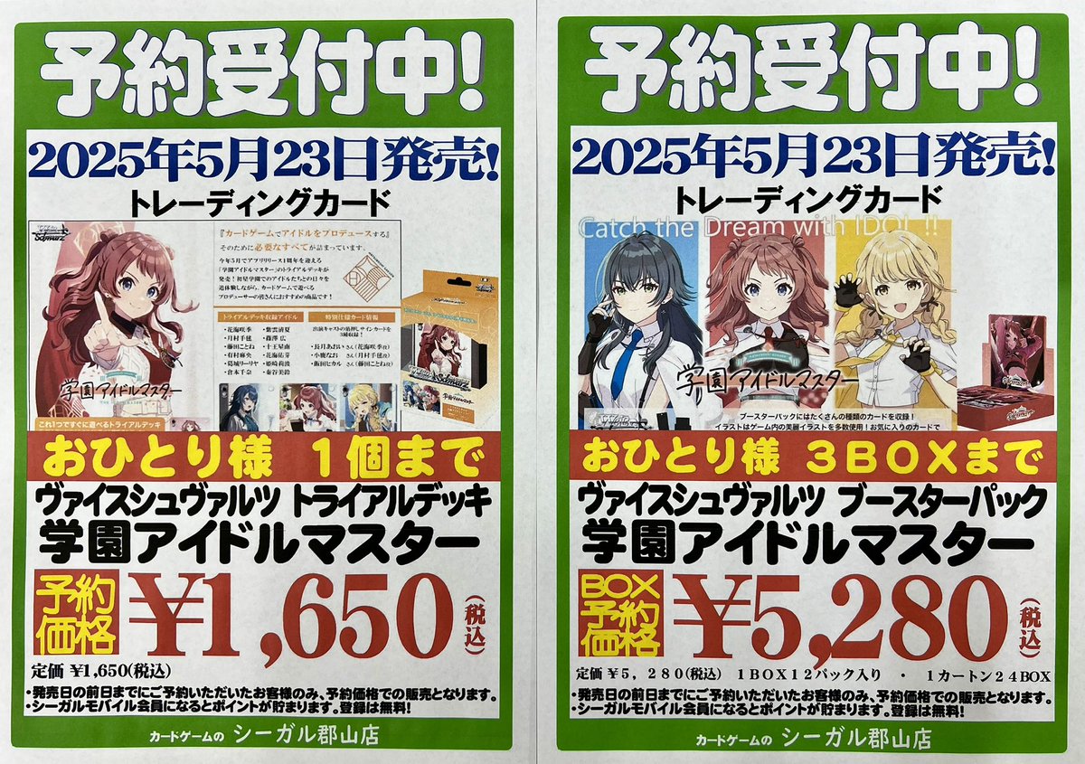 【ご予約受付中】 5/23 発売 #ヴァイスシュヴァルツ トライアルデッキ ブースターパック 『学園アイドルマスター』 ご予約受付を再開しました❗️ 本日以降のご予約分につきましては個数制限等変更となっていますのでご注意下さい ※すでにご予約済みのお客様は変更ございません #シーガル郡山店予約