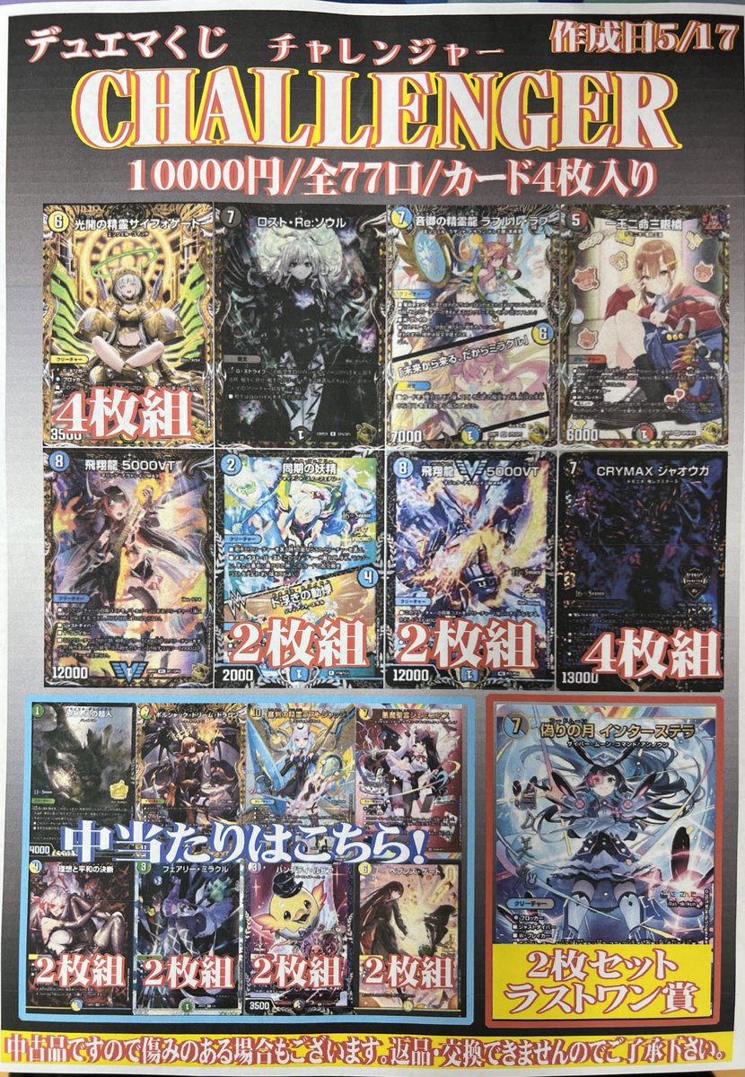 こんにちは! 《デュエマくじCHALLENGER》 10,000円 全77口で販売開始です‼️ サイフォゲート金トレジャー4枚組やReソウル金トレジャーなど豪華ラインナップでお待ちしております(*´ω`*) 是非ぜひチャレンジしてみてください✨️