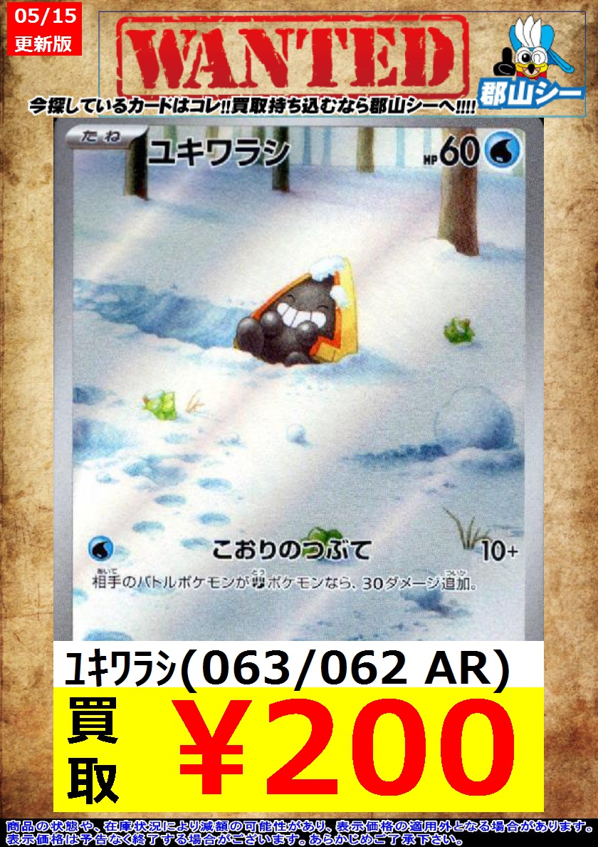 シーガル郡山店ポケカ数量限定お買取り情報更新です!よろしくお願いいたします! ※商品の状態や在庫状況により減額の可能性があり、表示価格の適用外となる場合がございます。 ユキワラシ(063/062 AR) ¥200