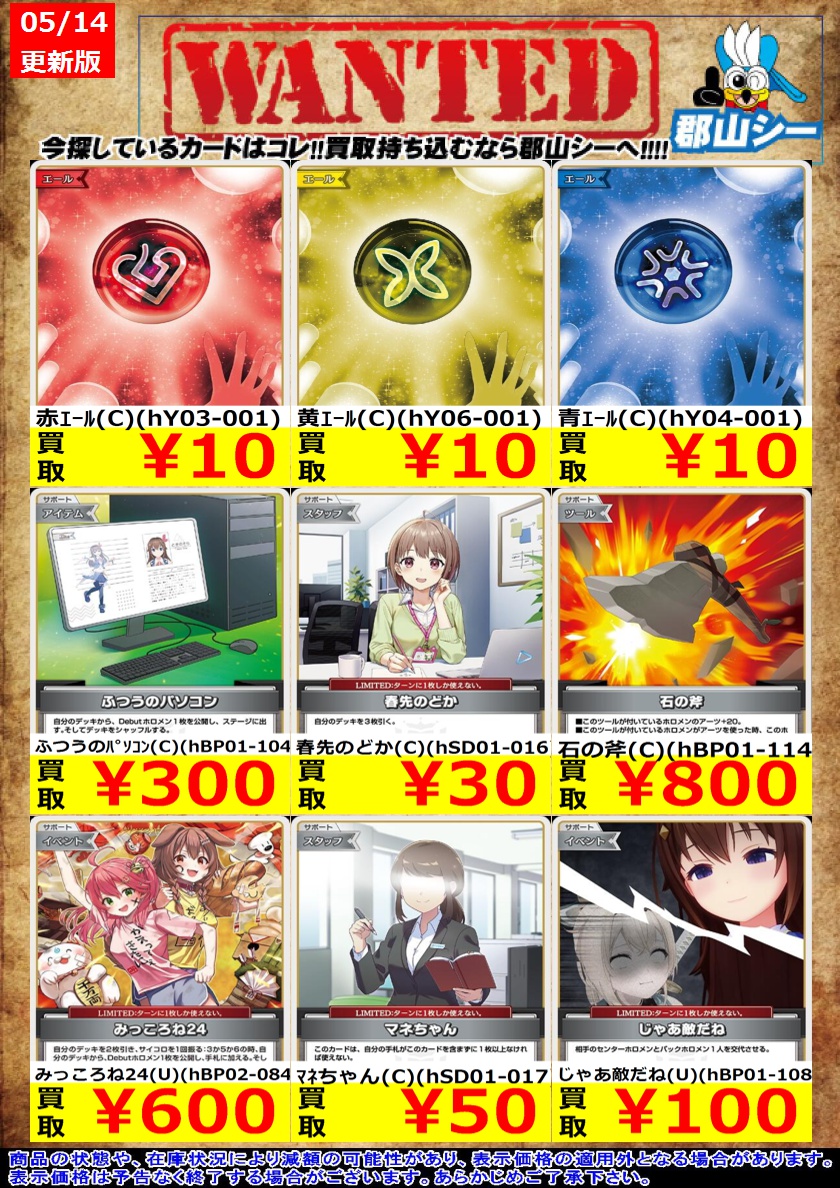 シーガル郡山店ホロライブOCGお買取り情報!! ※商品の状態や在庫状況により減額の可能性があり、表示価格の適用外となる場合がございます。 緑エール(大神ミオ)(SY)(hY02-002) ¥1,500 紫エール(紫咲シオン)(SY)(hY05-002) ¥1,800 緑エール(風真いろは)(SY)(hY02-003) ¥1,800