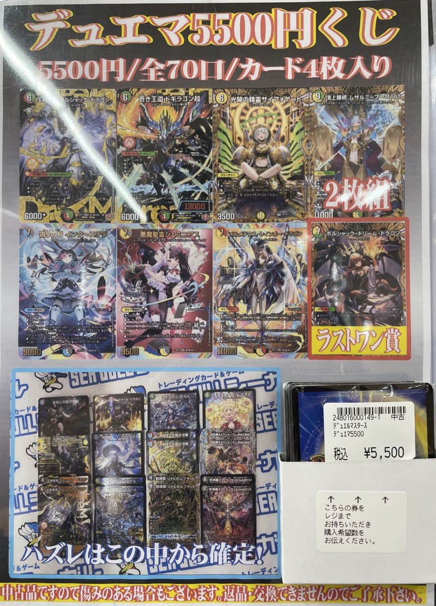POPに誤りがあったため再度告知いたします🙇♂️ デュエマ5500円くじ、全70口で作成いたしました❗️ 今回は大当たりに2種類のドリームレアシークレットを準備いたしました✨ ぜひお試しください😊