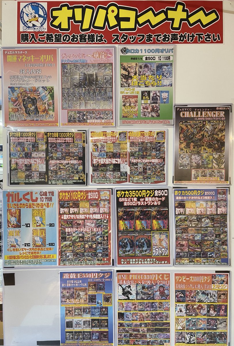 こんにちは(」・ω・) シーガル郡山店です。 ただいま展開中のオリパ各種はこちらとなっております。 ご来店お待ちしております‼️