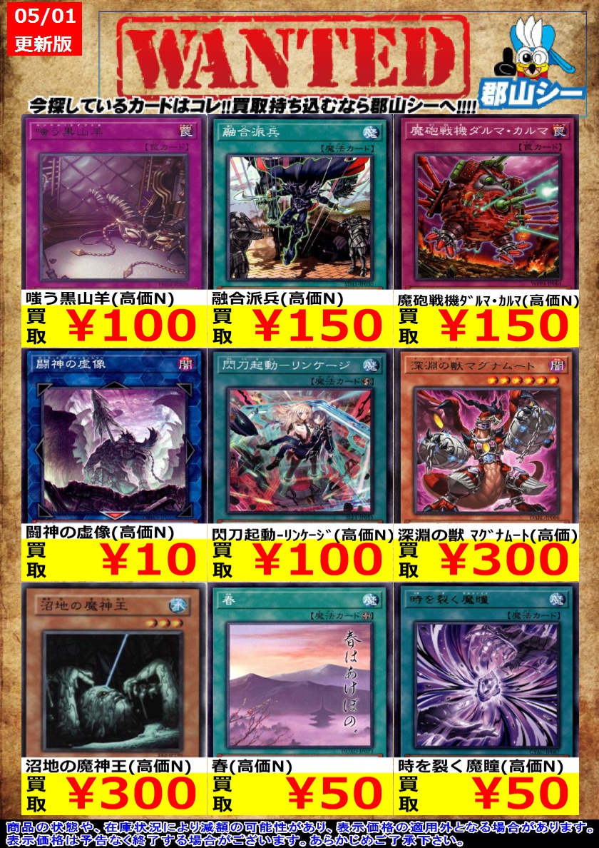 シーガル郡山店遊戯王お買取り情報 ※商品の状態や在庫状況により減額の可能性があり、表示価格の適用外となる場合がございます。 K9-17号 イヅナ(高価N) ¥10 WAKE CUP! モカ(高価N) ¥30 時を裂く魔瞳(高価N) ¥50 #遊戯王 #シーガル #郡山店
