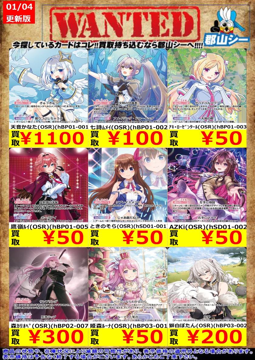 シーガル郡山店ホロライブOCGお買取り情報!! ※商品の状態や在庫状況により減額の可能性があり、表示価格の適用外となる場合がございます。 百鬼あやめ(OSR)(hBP06-004) ¥1,000 風真いろは(OSR)(hBP06-003) ¥1,100 ロボ子さん(OSR)(hBP06-007) ¥100