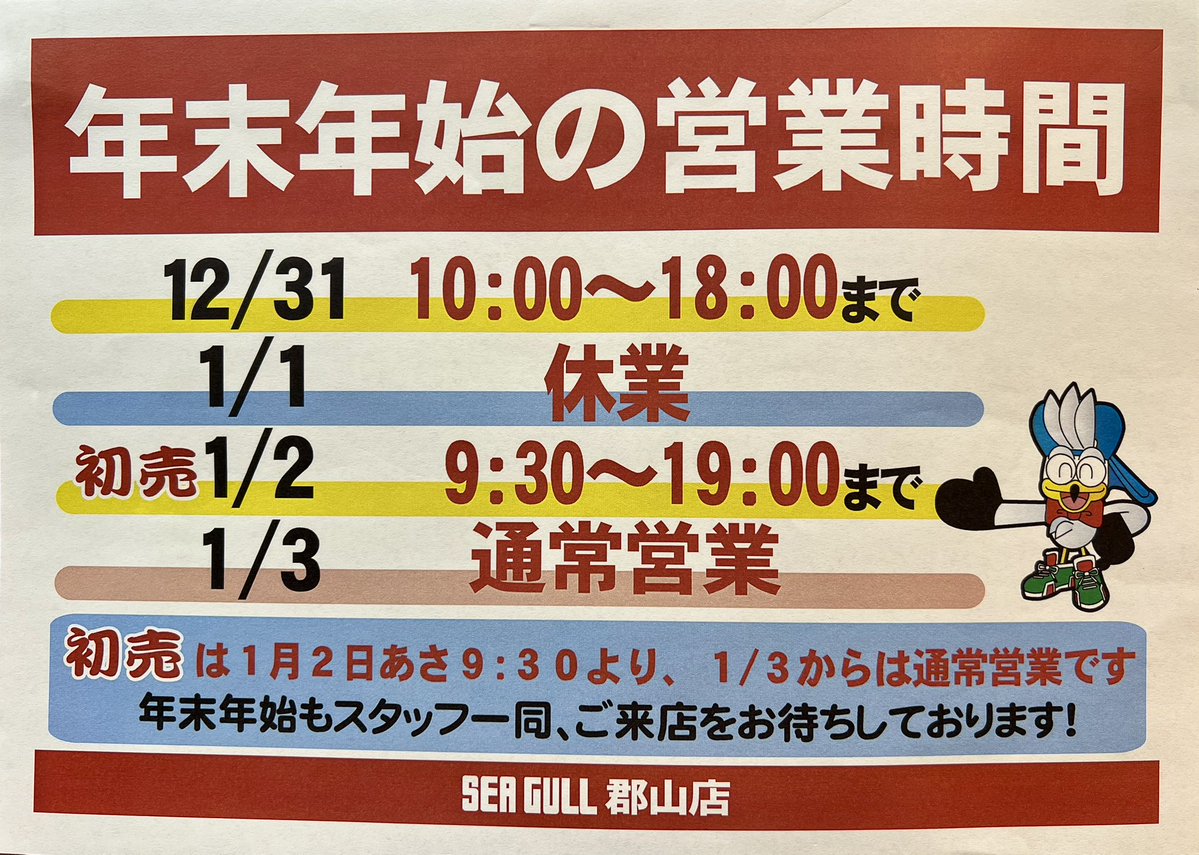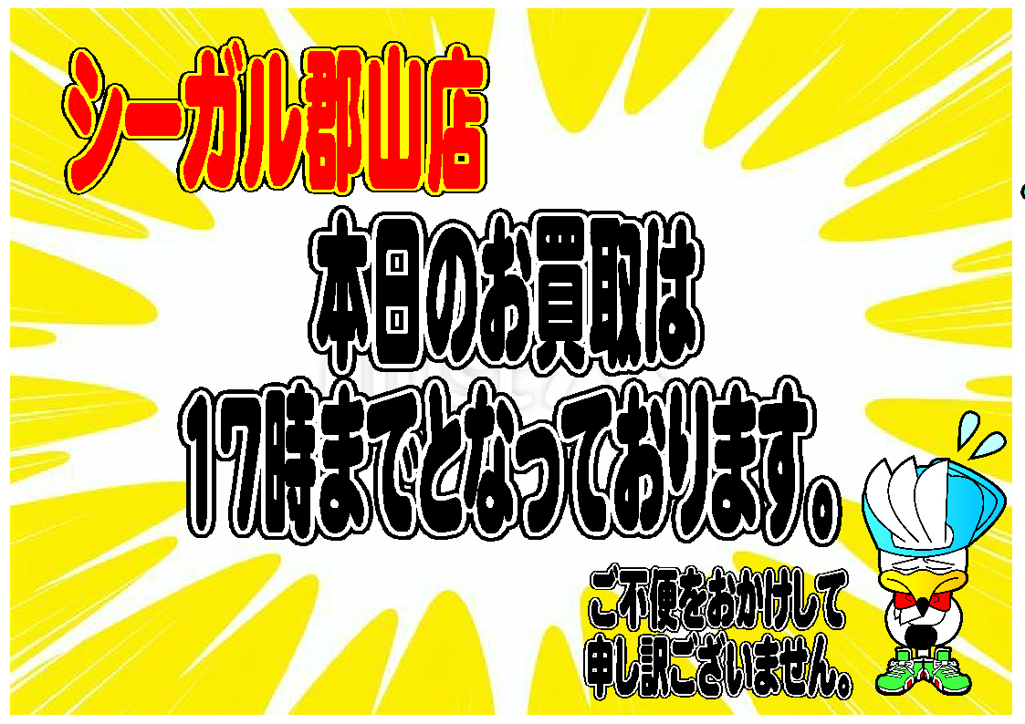 こんにちは! シーガル郡山店です。 本日は初売り準備のため、 お買取は17時までとなっております。 ご不便をおかけして申し訳ございません。