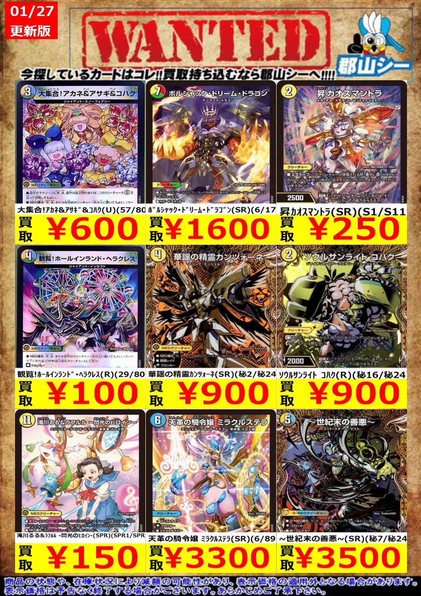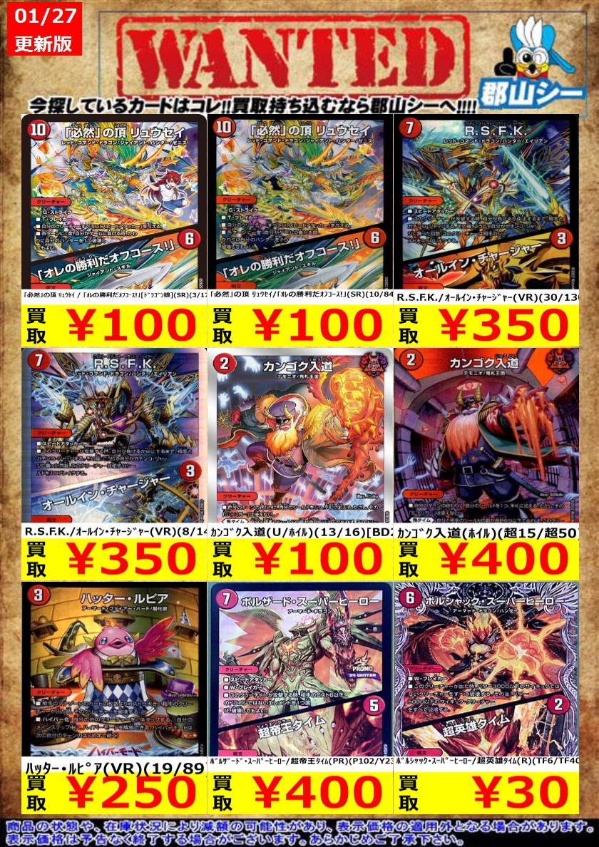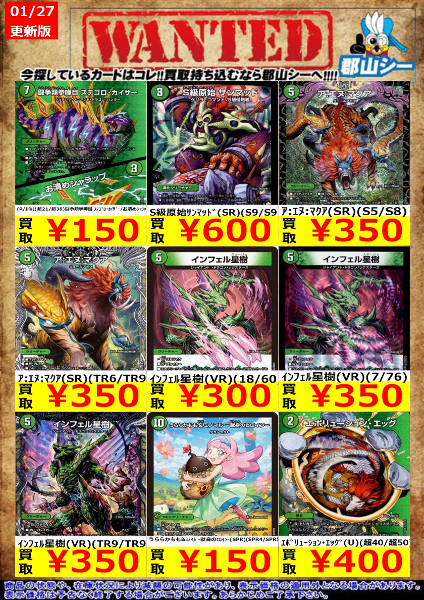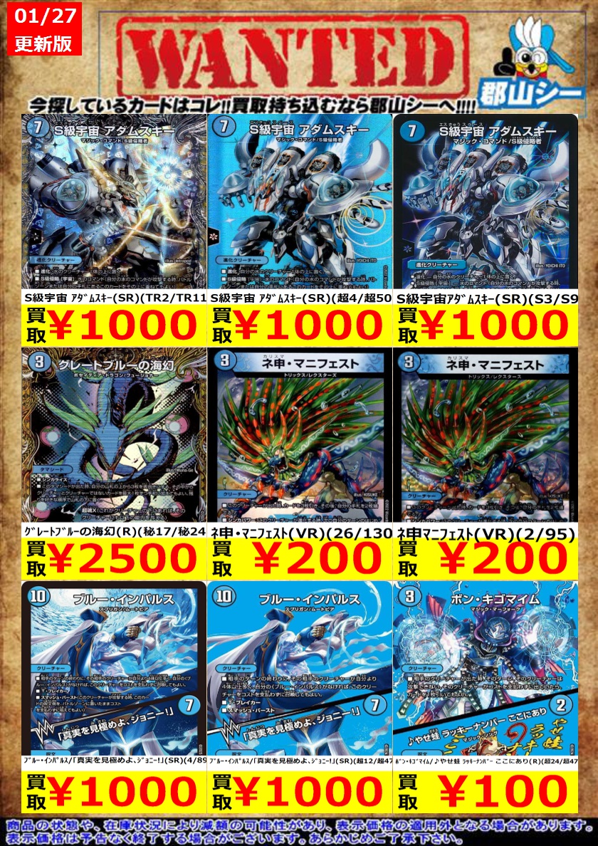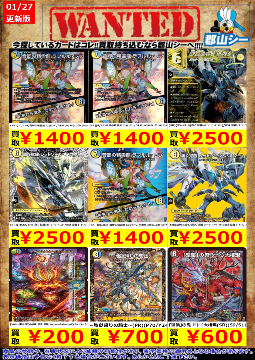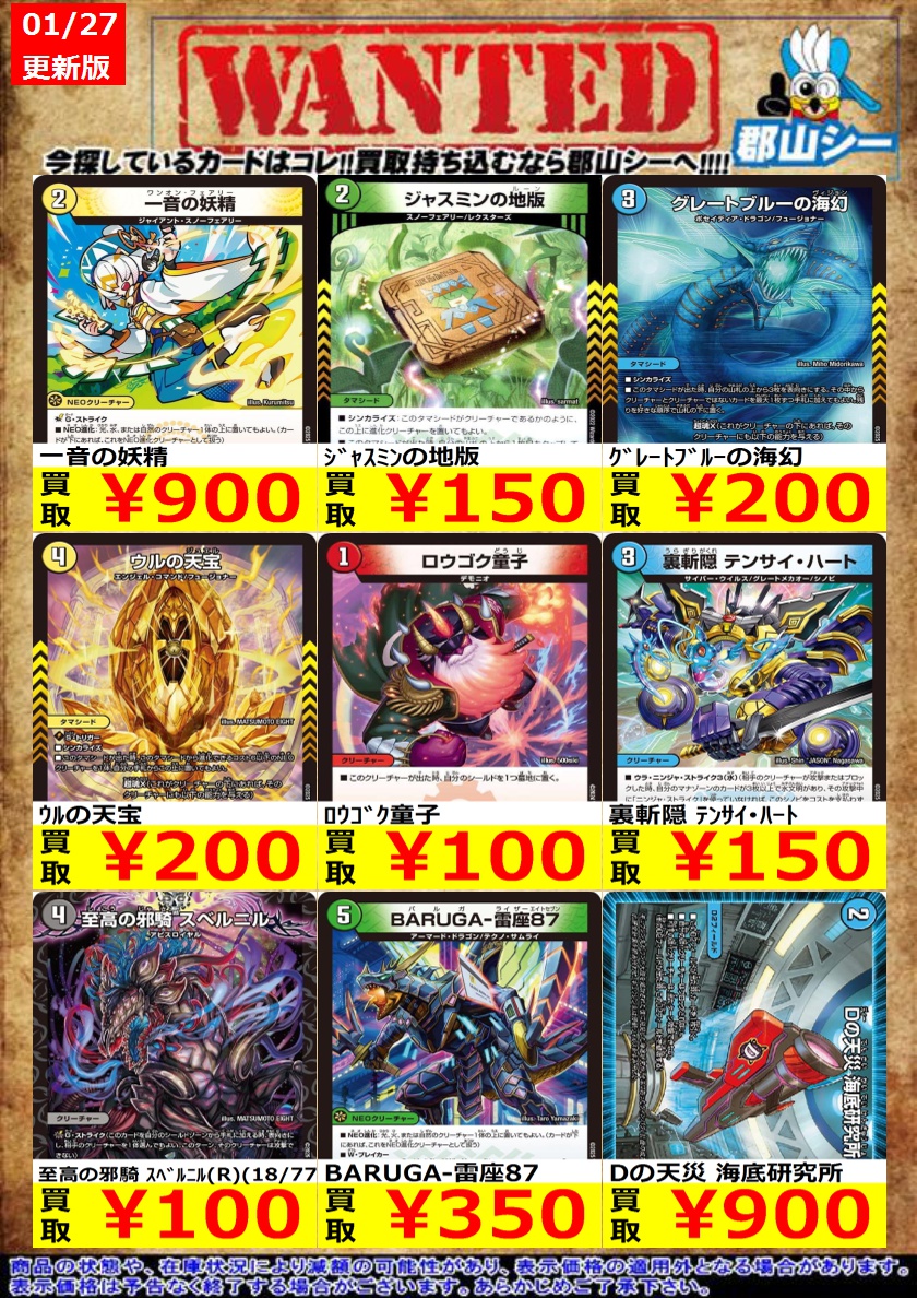 シーガル郡山店デュエマノーマルお買取り情報!! ※商品の状態や在庫状況により減額の可能性があり、表示価格の適用外となる場合がございます。 ジャスミンの地版 ¥150 ウルの天宝 ¥200 グレートブルーの海幻 ¥200