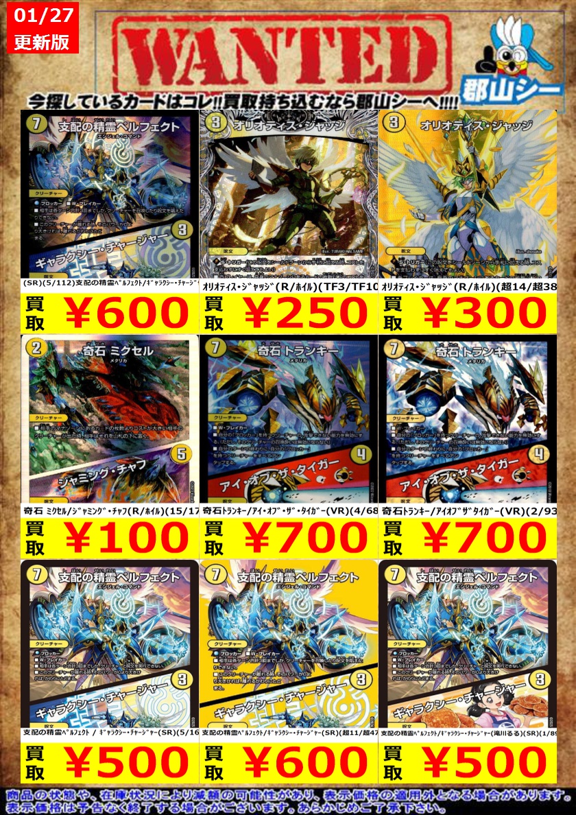 シーガル郡山店デュエマお買取り情報!! ※商品の状態や在庫状況により減額の可能性があり、表示価格の適用外となる場合がございます。 料理猫のプワソン(VR)(16/89) ¥300 支配の精霊ペルフェクト / ギャラクシー・チャージャー(SR)(5/16) ¥500