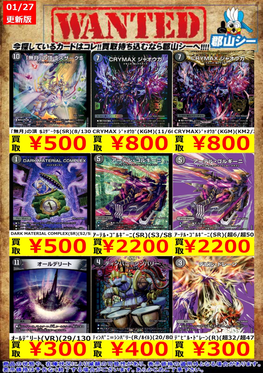 シーガル郡山店デュエマお買取り情報!! ※商品の状態や在庫状況により減額の可能性があり、表示価格の適用外となる場合がございます。 堕∞魔 ヴォゲンム(R)(超28/超47) ¥200 CRYMAXジャオウガ(KGM)(KM2/2) ¥800 邪魂龍 ジャビビルブラッド(SR)(S6/S10) ¥800