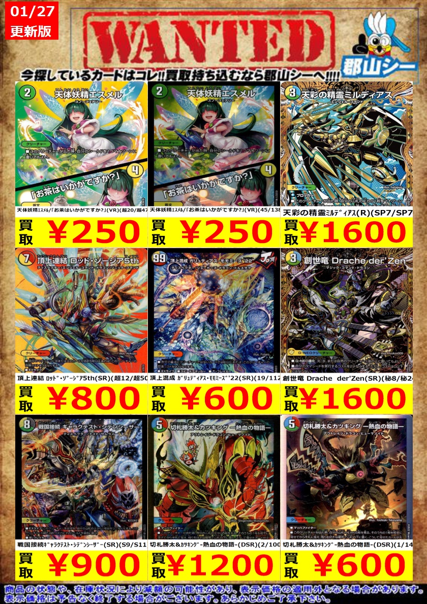 シーガル郡山店デュエマお買取り情報!! ※商品の状態や在庫状況により減額の可能性があり、表示価格の適用外となる場合がございます。 次世代龍覇 グレングラッサ/「ここはまかせて、お姉ちゃん!」(ホイル)(12/19) ¥150 天体妖精エスメル/「お茶はいかがですか?」(VR)(45/138) ¥250