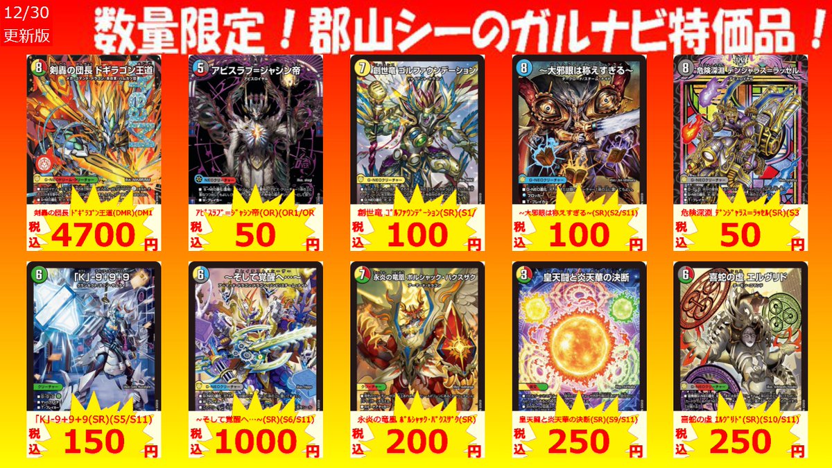 数量限定!郡山シー限定ガルナビ特価品 虚ト成リシ古ノ蛇神ノ咆哮 ¥50 天災デドダム ¥100 凶乱タル月光ノ夜鏡(VR)(8/78) ¥100 #デュエマ #シーガル郡山 #アツアツ特価