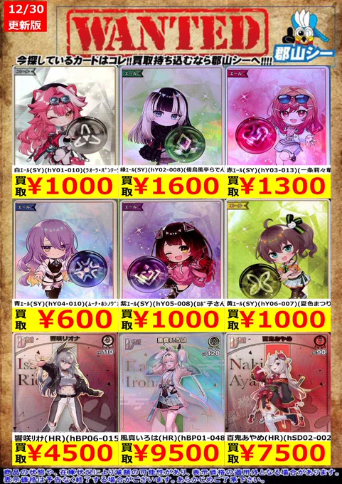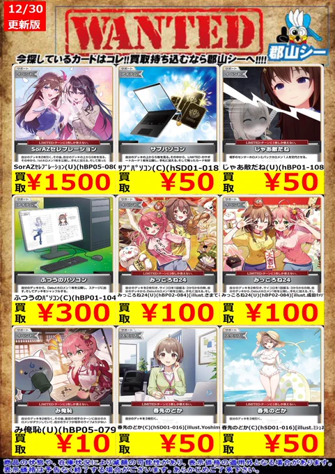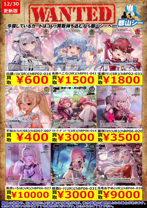 シーガル郡山店ホロライブOCGお買取り情報!! ※商品の状態や在庫状況により減額の可能性があり、表示価格の適用外となる場合がございます。 戌神ころね(SR)(hBP06-069) ¥700 戌神ころね(SR)(hBP06-070) ¥900 百鬼あやめ(SR)(hBP06-039) ¥1,000