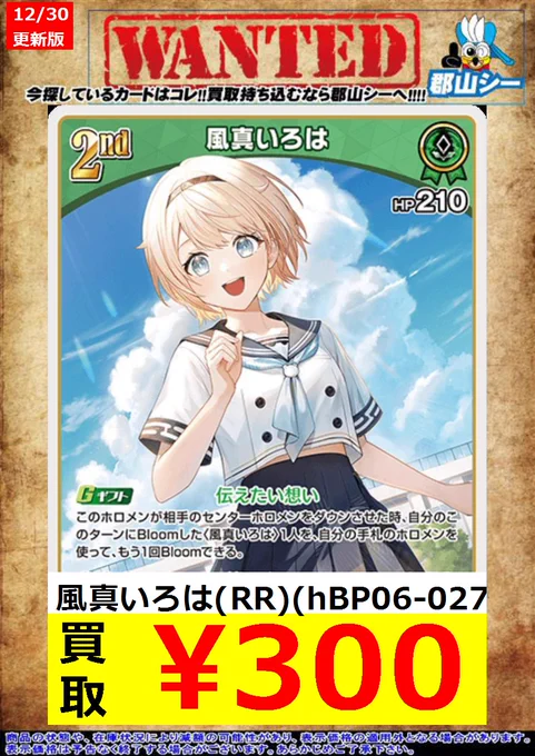 シーガル郡山店ホロライブOCGお買取り情報!! ※商品の状態や在庫状況により減額の可能性があり、表示価格の適用外となる場合がございます。 風真いろは(RR)(hBP06-027) ¥300