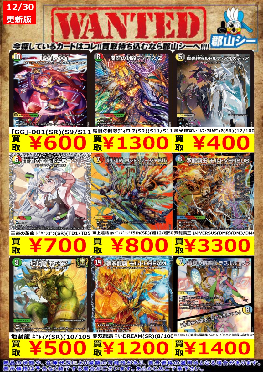 シーガル郡山店デュエマお買取り情報!! ※商品の状態や在庫状況により減額の可能性があり、表示価格の適用外となる場合がございます。 邪心タル悪魔神ノ禍魂(VR)(3/78) ¥100 創世竜 Drache der’Zen(SR)(S7/S11) ¥300 竜社長 ゴルファウンデーション(SR)(S8/S11) ¥400