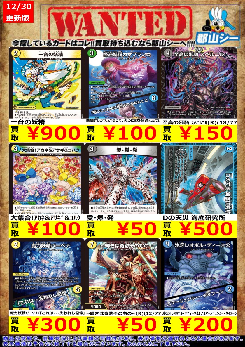 シーガル郡山店デュエマノーマルお買取り情報!! ※商品の状態や在庫状況により減額の可能性があり、表示価格の適用外となる場合がございます。 愛・爆・発 ¥50 怪盗妖精カサブランカ/「信じていたのに裏切られるなんて!」 ¥100 大集合!アカネ&アサギ&コハク ¥100
