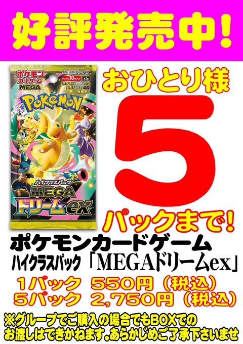 #ポケモンカードゲーム ハイクラスパック 「MEGAドリームex」 在庫ございます❗️ ※おひとり様5パックまでとなります (グループでご購入の場合でもBOXのお渡しはできかねます。あらかじめご了承下さい) 皆様のご来店をお待ちしております😊