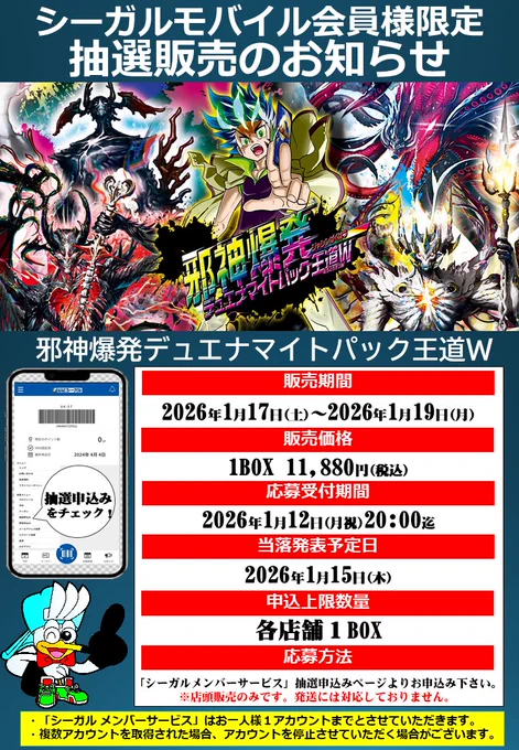 ✅抽選予約受付開始 1月17日(土)発売 #デュエル・マスターズTCG 邪神爆発デュエナマイトパック「王道W」 本日より抽選予約の受付を開始しました! シーガルモバイル会員 「ガルモバ」 よりお申し込みいただけます✨ ぜひご応募ください! ※応募締切:2026年1月12日(月祝)20:00まで