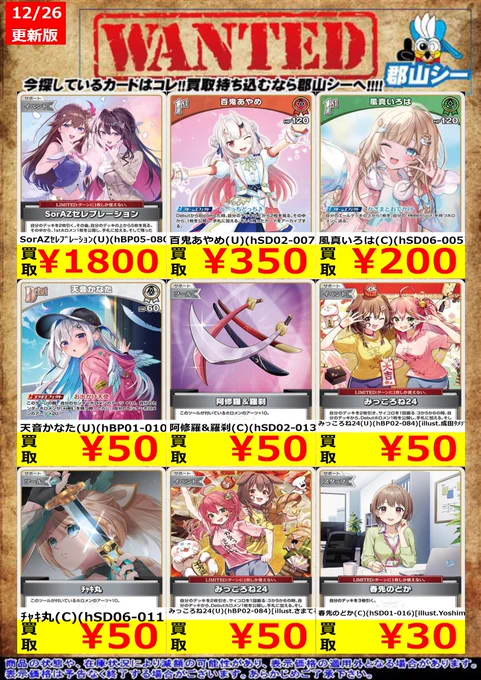 シーガル郡山店ホロライブOCGノーマルお買取り情報!! ※商品の状態や在庫状況により減額の可能性があり、表示価格の適用外となる場合がございます。 AZKi(U)(hBP01-045) ¥10 癒月ちょこ(U)(hSD04-004) ¥10 癒月ちょこ(U)(hSD04-007) ¥10