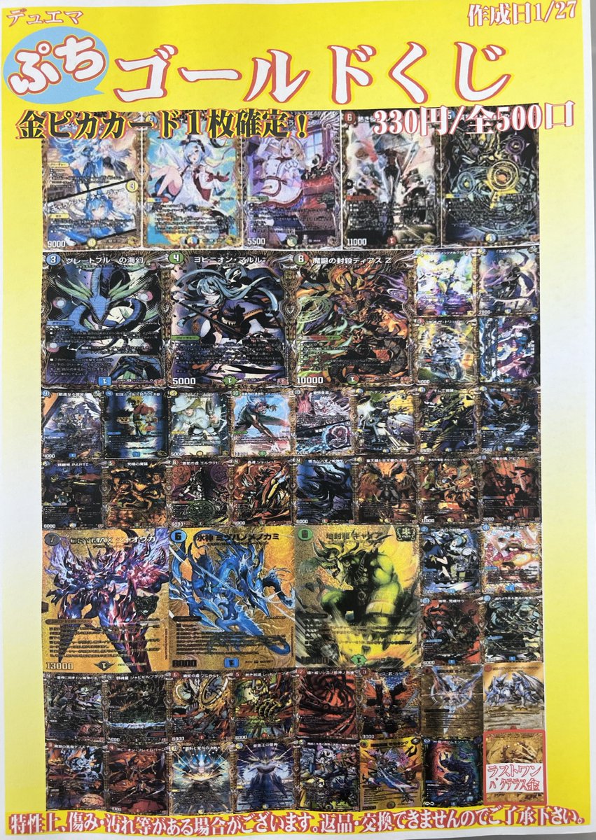 🌈デュエマぷちゴールドくじ🌈 330円 全500口で販売開始‼️ 大当たりは豪華金トレジャー💕✨️ その他にも汎用カードのシクなど盛りだくさんです❕ 是非ぜひ摘んでみてくださいね(*´ω`*)