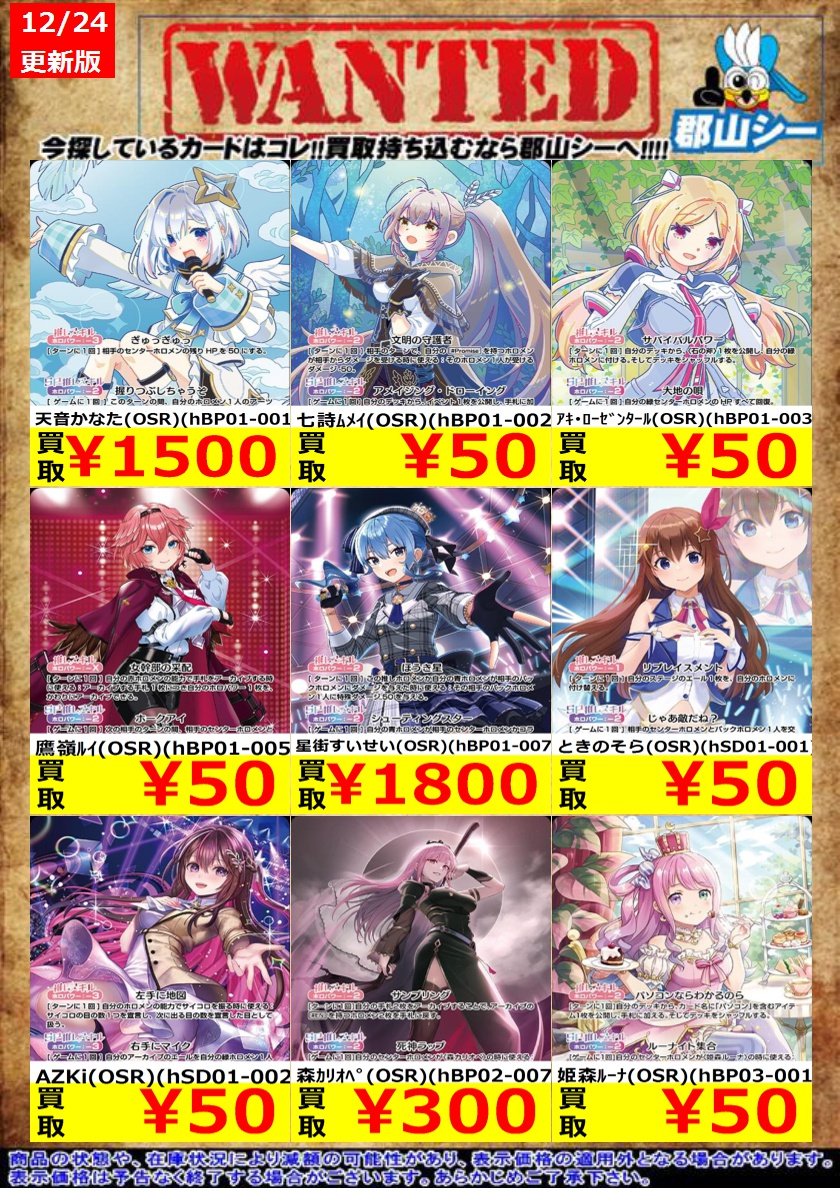 シーガル郡山店ホロライブOCGお買取り情報!! ※商品の状態や在庫状況により減額の可能性があり、表示価格の適用外となる場合がございます。 獅白ぼたん(UR)(hBP03-021) ¥2,500 姫森ルーナ(UR)(hBP03-014) ¥1,600 赤井はあと(UR)(hBP03-034) ¥700