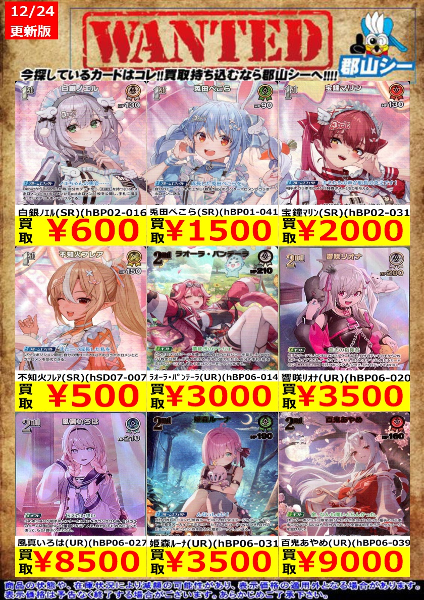 シーガル郡山店ホロライブOCGお買取り情報!! ※商品の状態や在庫状況により減額の可能性があり、表示価格の適用外となる場合がございます。 白銀ノエル(SR)(hBP02-016) ¥600 兎田ぺこら(SR)(hBP01-041) ¥1,500 宝鐘マリン(SR)(hBP02-031) ¥2,000