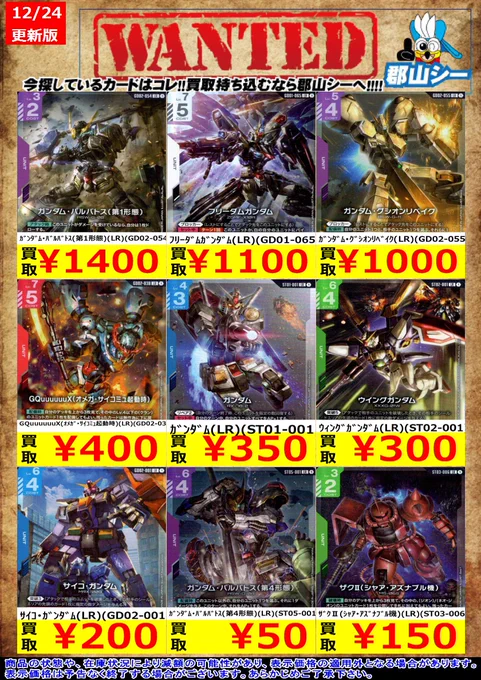 こんにちは(」・ω・) シーガル郡山店の田中です。 ガンダムカード 特価品を追加致しました。 ご来店お待ちしております。