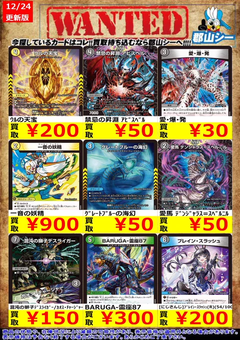 シーガル郡山店デュエマノーマルお買取り情報!! ※商品の状態や在庫状況により減額の可能性があり、表示価格の適用外となる場合がございます。 愛・爆・発 ¥30 グレートブルーの海幻 ¥50 禁忌の昇淵 アビスベル ¥50