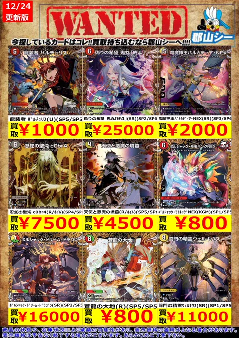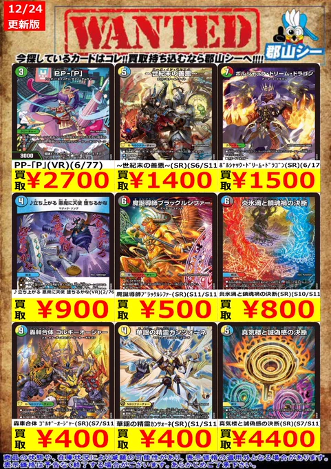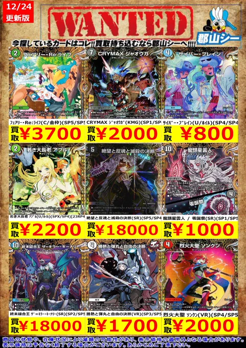 シーガル郡山店デュエマお買取り情報! ※商品の状態や在庫状況により減額の可能性があり、表示価格の適用外となる場合がございます。 「必勝」の頂カイザー「刃鬼」(SSP)(SSP1/SSP3) ¥8,000 「祝」の頂 ウェディング(SSP)(SSP3/SSP3) ¥270,000 闘門の精霊ウェルキウス(SR)(SP1/SP5) ¥11,000