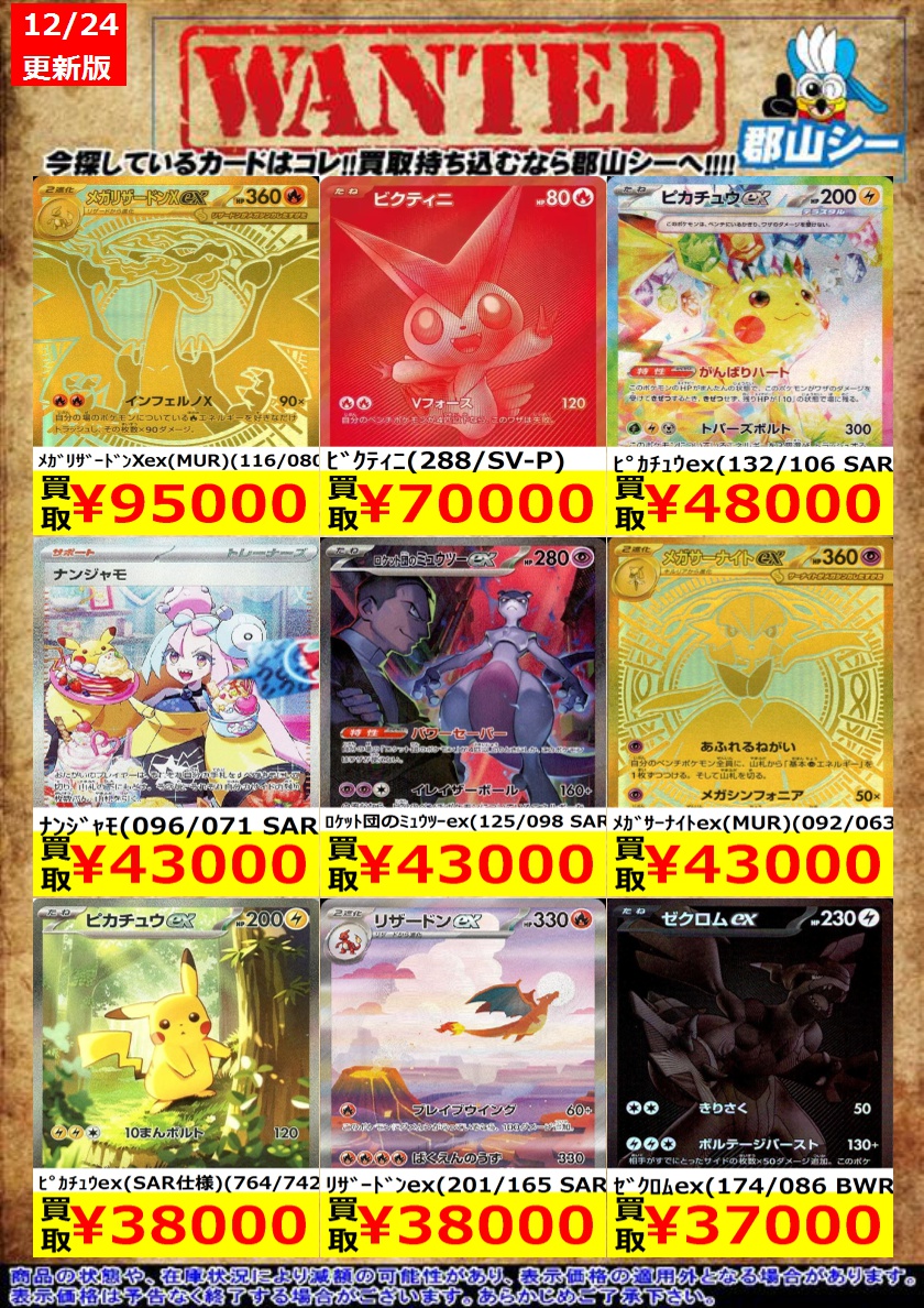シーガル郡山店ポケカ数量限定お買取り情報更新です!よろしくお願いいたします! ※商品の状態や在庫状況により減額の可能性があり、表示価格の適用外となる場合がございます。 ピカチュウex(SAR)(234/193) ¥22,000 リーリエのピッピex(SAR仕様)(765/742) ¥34,000