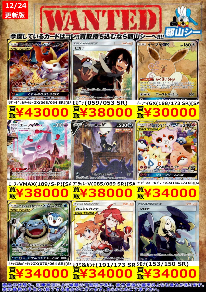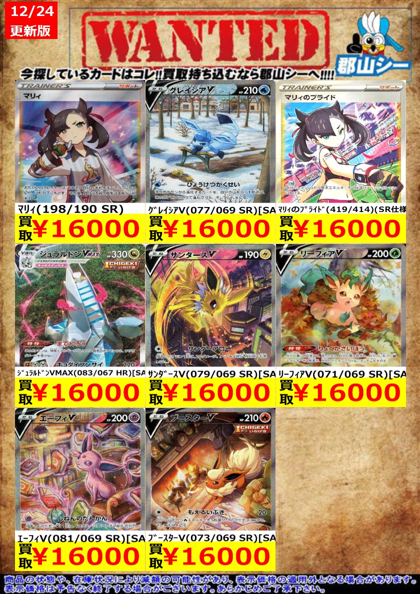 シーガル郡山店ポケカ数量限定お買取り情報更新です!よろしくお願いいたします! ※商品の状態や在庫状況により減額の可能性があり、表示価格の適用外となる場合がございます。 マリィ(198/190 SR) ¥16,000 エーフィV(081/069 SR)[SA] ¥16,000 マリィのプライド(419/414)(SR仕様) ¥16,000