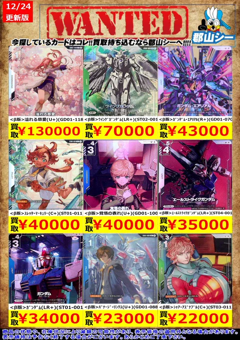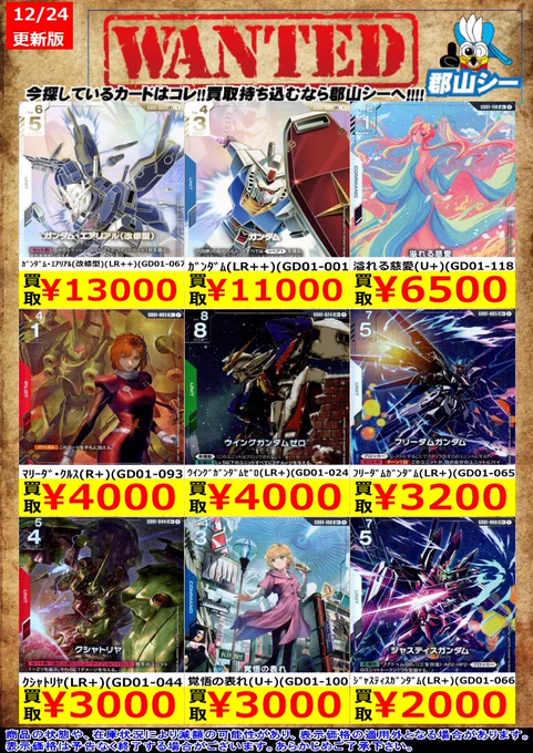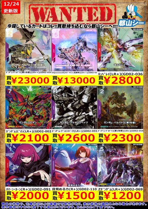 シーガル郡山店ガンダムCGお買取情報!! 逆転の一手(R+)(GD02-100) ¥300 ガンダム・キマリス(LR+)(GD02-070) ¥100 リソース(GQuuuuuuX)(C++)(R-015) ¥400