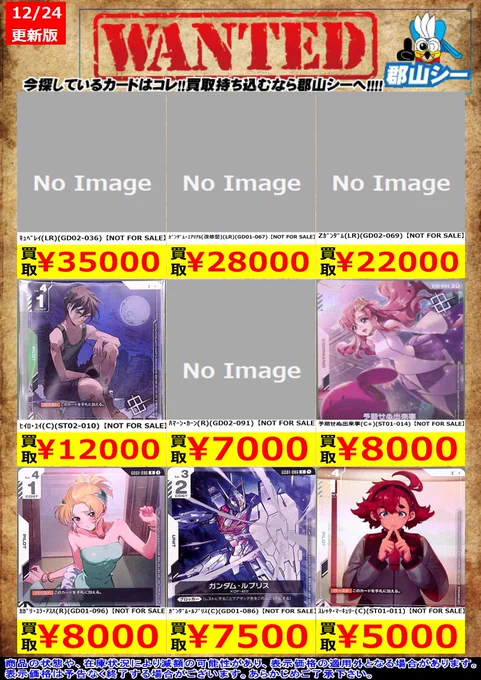シーガル郡山店ガンダムCGお買取情報!! 格闘戦(C)(ST03-013)【NOT FOR SALE】 ¥3,000 ヒイロ・ユイ(C)(ST02-010)【NOT FOR SALE】 ¥12,000 カミーユ・ビダン(R)(GD02-097)【NOT FOR SALE】 ¥1,000