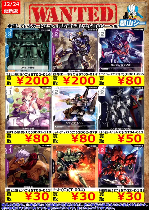 シーガル郡山店ガンダムCGお買取情報!! 覚悟の表れ(U)(GD01-100) ¥10 ストライカーパック(C)(ST04-012) ¥50 ガンダム・ルブリス(C)(GD01-086) ¥80