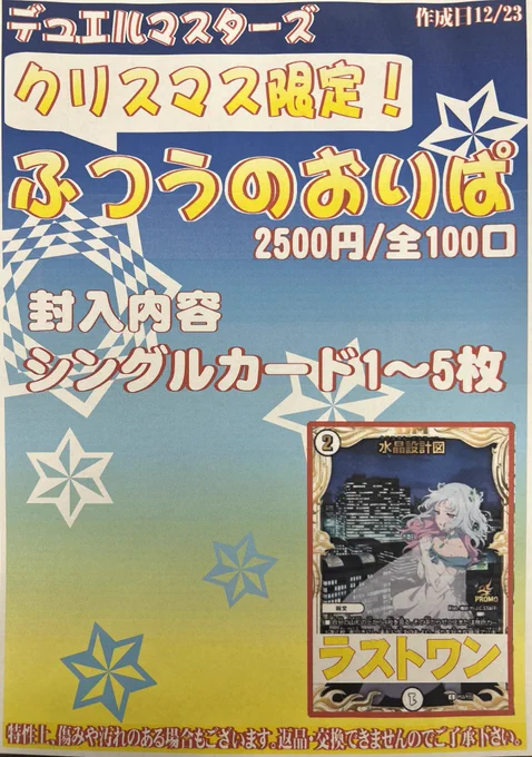 おはようございます☀️ 本日より、デュエマ クリスマス限定《ふつうのおりぱ》 ¥2,500 全100口 販売開始致します‼️ 店頭売価2,500円以上確定封入(作成日時点)✨️ 是非ぜひお試しください(*´ω`*)