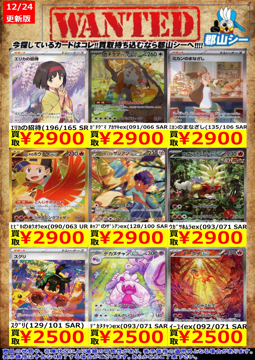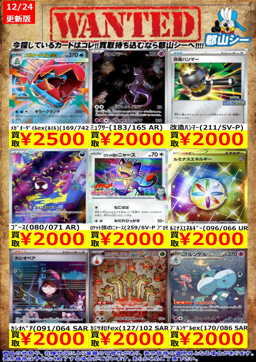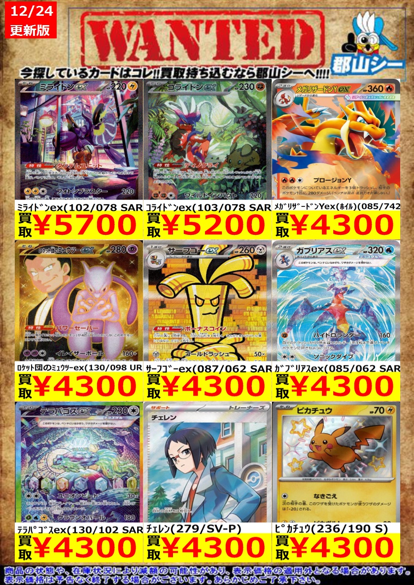 シーガル郡山店ポケカ数量限定お買取り情報更新です!よろしくお願いいたします! ※商品の状態や在庫状況により減額の可能性があり、表示価格の適用外となる場合がございます。 ピカチュウ(074/SV-P) ¥4,300 イーブイex(223/187 SAR) ¥3,800 メガリザードンYex(ホイル)(085/742) ¥4,300